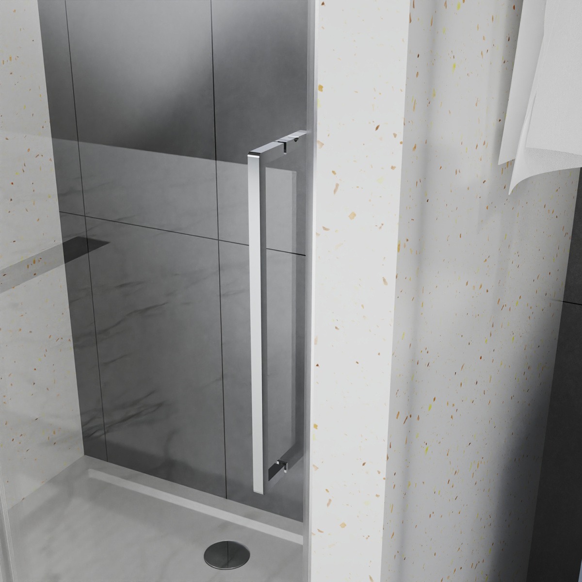 - Дверь в нишу Раздвижная, с универсальной (L/R) откатной дверью, на двойных роликах с нержавеющими подшипниками. Ручки выполнены из латуни в цвет профиля.