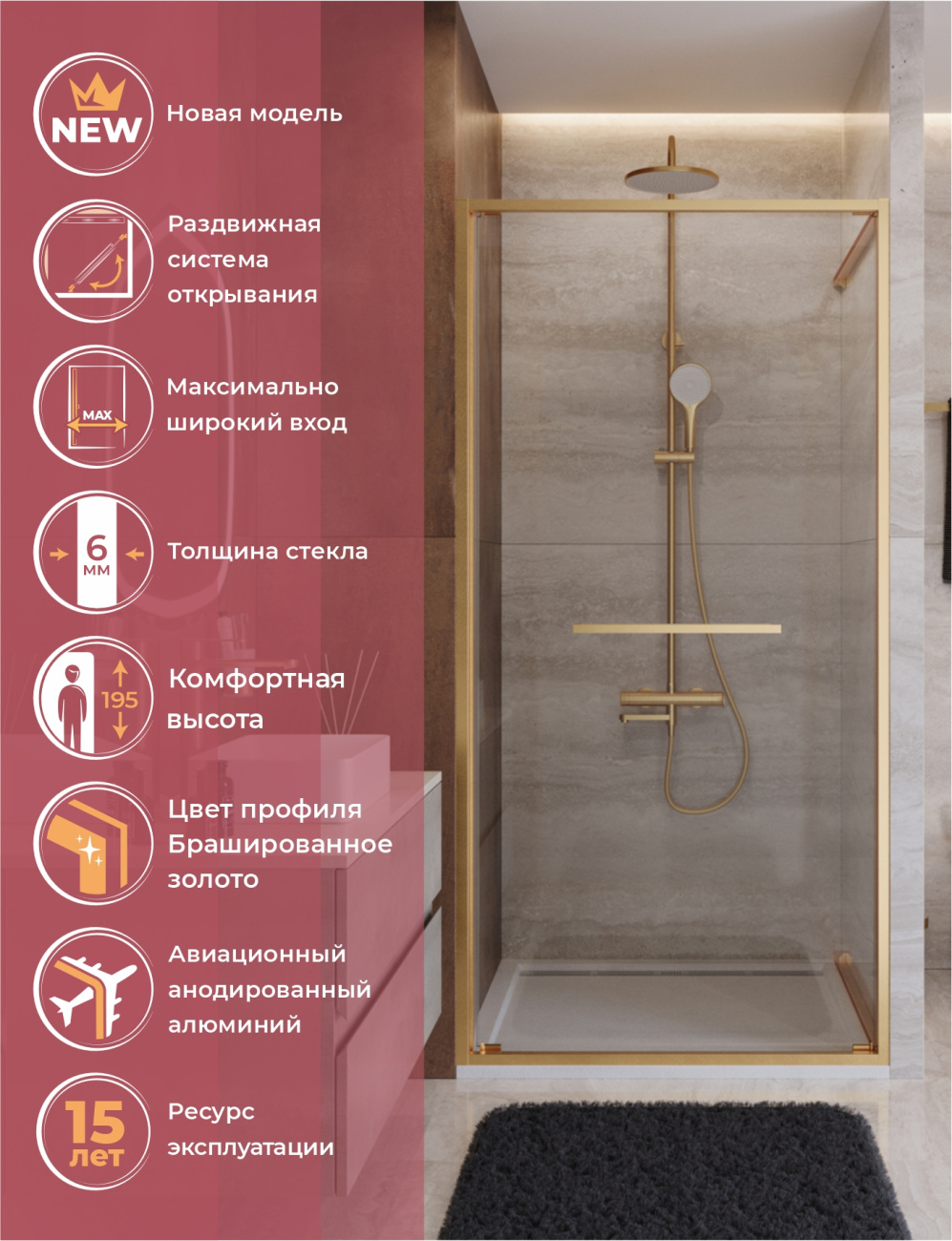 Душевая дверь Cezares Lux 90 см LUX-B-FS-1-90-C-BORO, брашированное золото/прозрачное