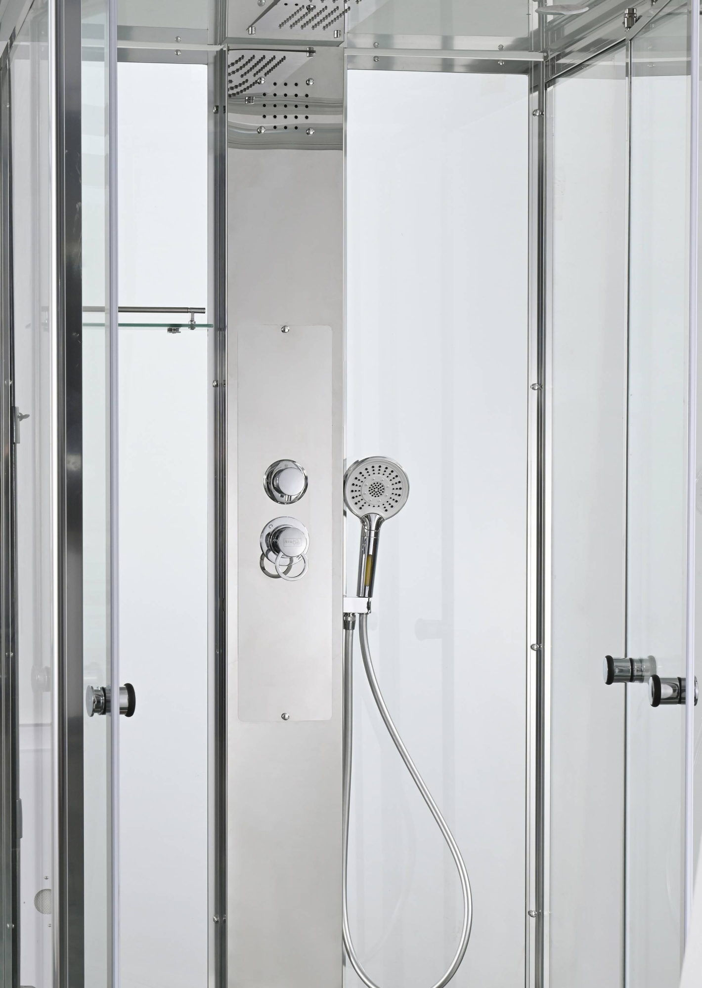 Стильная душевая кабина AvaCan сочетает в себе высокую функциональность, практичность и надежность. При изготовлении применяется безопасное закаленное стекло, надежно фиксируемое алюминиевым профилем. Профиль сделан из алюминия повышенной прочности. Сборка без силикона (увеличивает срок службы, защищает от протечек), внутренняя сборка (облегчает установку и ревизию; позволяет установить в ограниченном пространстве и обойтись без демонтажа других сантехнических приборов), смеситель резьбовой (без хомутов).Двойные металлические ролики дверей (распределение нагрузки на два ролика, увеличивают срок службы). Душевая штанга(позволяет регулировать по высоте ручную лейку), ручная арома-лейка с витамином С (картридж в комплекте,есть возможность замены или удаления картриджа), полочки(из стекла, с ограничителем), сифон с гидрозатвором.