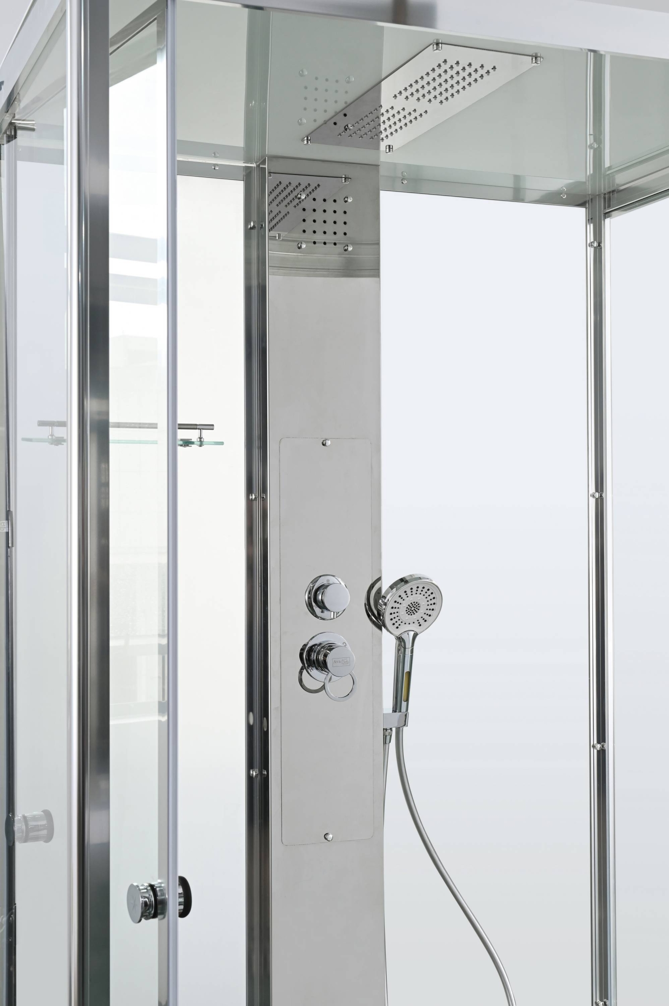 Стильная душевая кабина AvaCan сочетает в себе высокую функциональность, практичность и надежность. При изготовлении применяется безопасное закаленное стекло, надежно фиксируемое алюминиевым профилем. Профиль сделан из алюминия повышенной прочности. Сборка без силикона (увеличивает срок службы, защищает от протечек), внутренняя сборка (облегчает установку и ревизию; позволяет установить в ограниченном пространстве и обойтись без демонтажа других сантехнических приборов), смеситель резьбовой (без хомутов). Двойные металлические ролики дверей (распределение нагрузки на два ролика, увеличивают срок службы). Душевая штанга(позволяет регулировать по высоте ручную лейку), ручная арома-лейка с витамином С (картридж в комплекте,есть возможность замены или удаления картриджа), полочки(из стекла, с ограничителем), сифон с гидрозатвором.