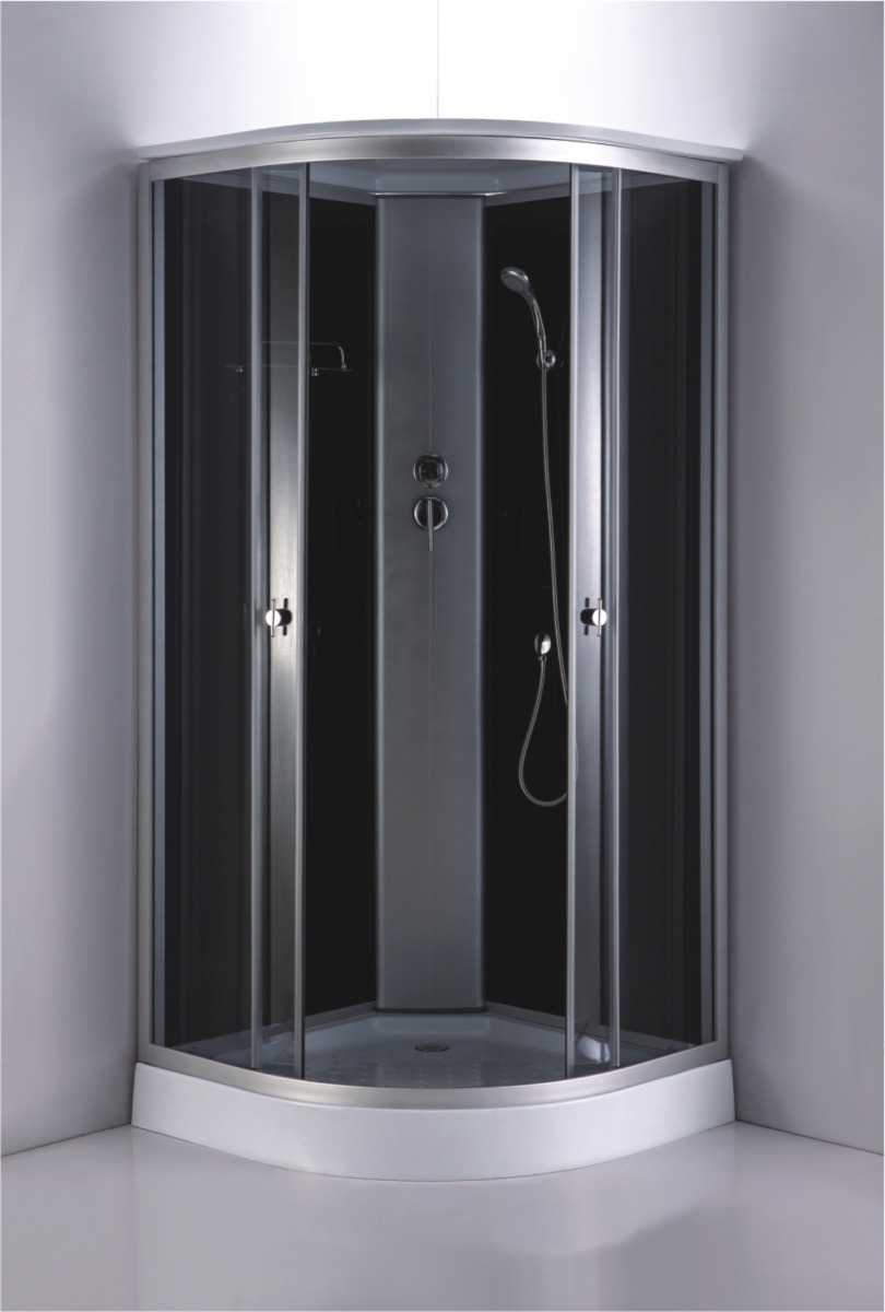Душевая кабина Loranto CS-881EA13TM/B-100 с низким поддоном и полкой в комплекте, размер 980х980х2150 мм, чёрная задняя стенка, профиль хром, стекло тонированное. Ширина входа 550 мм.