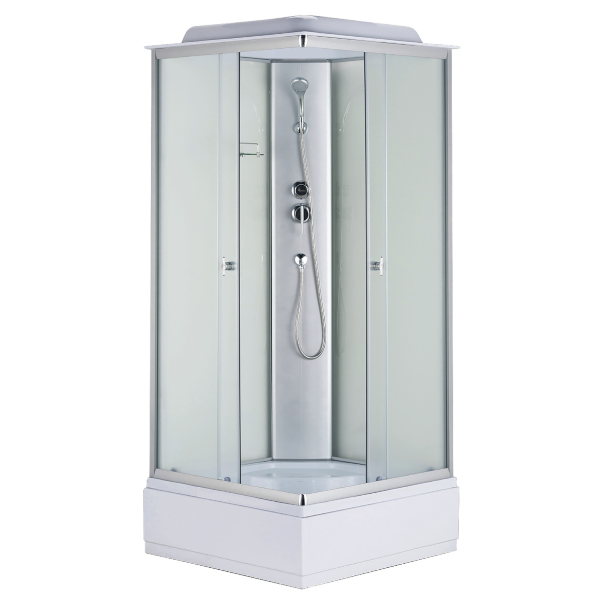 Душевая кабина Loranto CS-990ETM/W-100 со средним поддоном, размер 980х980х2150 мм, профиль хром, стекло матовое, цвет задней стенки белый. Ширина входа 515 мм.