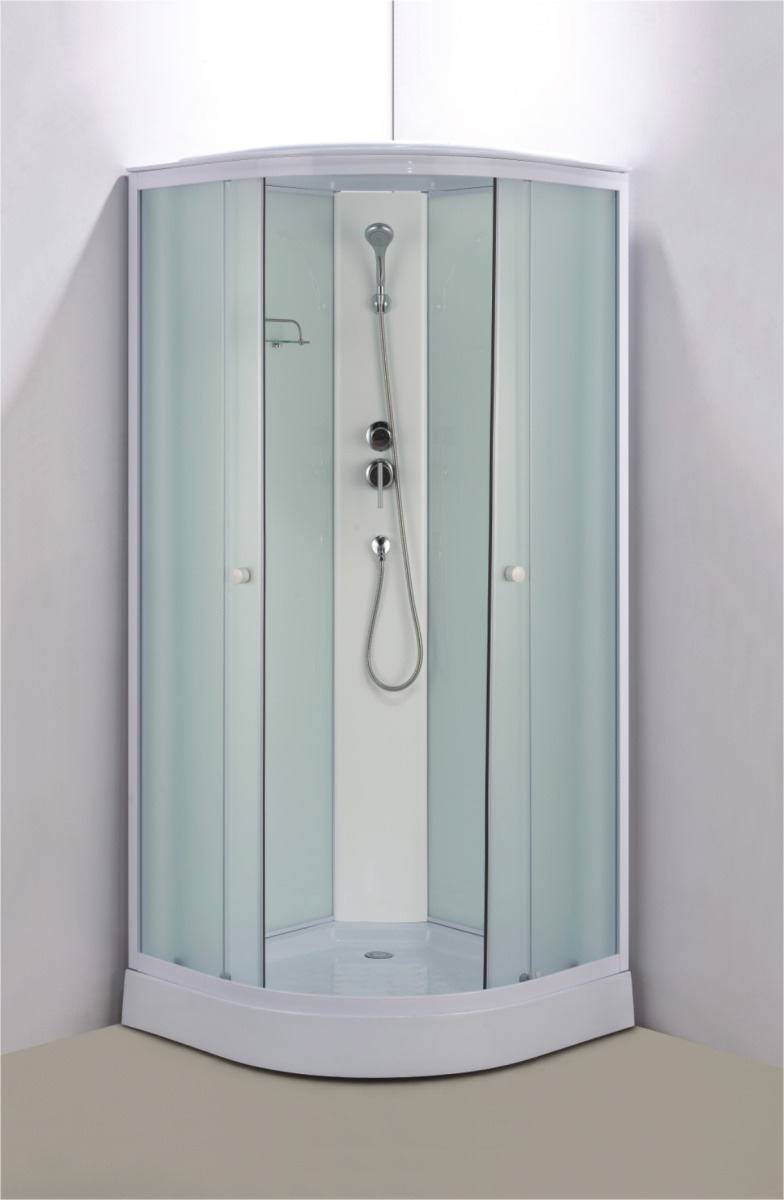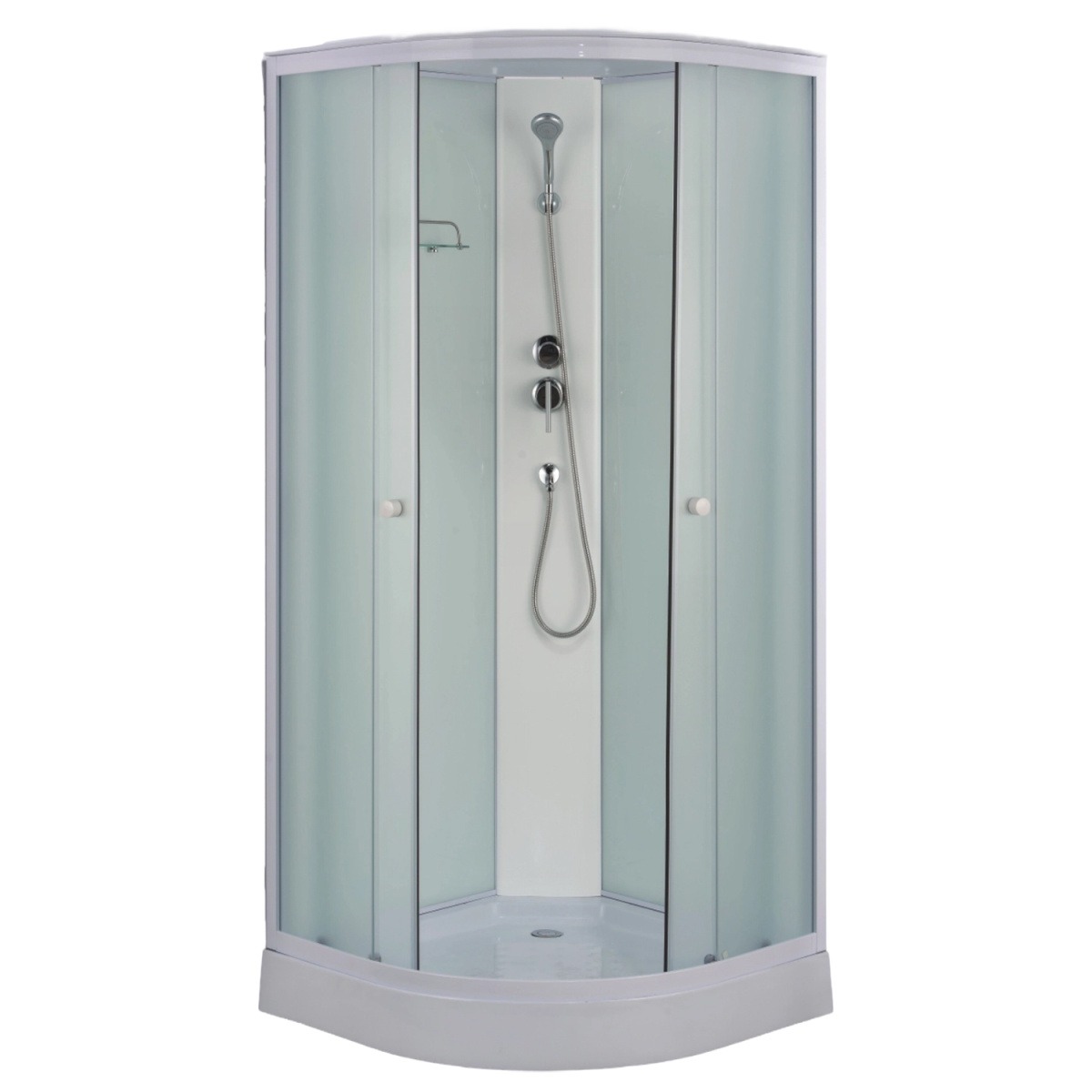 Душевая кабина Loranto CS-881ED13TM/W-90 с низким поддоном и полочкой, размер 880х880х2150 мм, цвет задних стенок белый, профиль белый, стекло матовое. Ширина входа 485 мм.