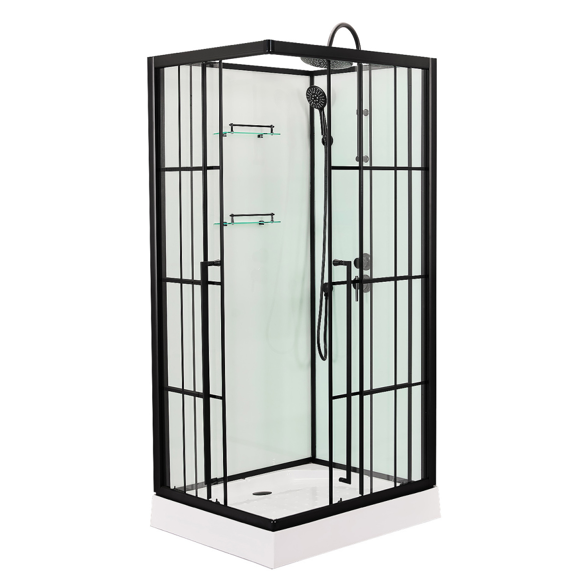 Душевая кабина Loranto CS-3008TM/W-90R с низким поддоном, правосторонняя, размер 880х880х2040 мм, ширина входа 470 мм, профиль чёрный, стекло прозрачное 4 мм. Задние стенки стеклянные белые.