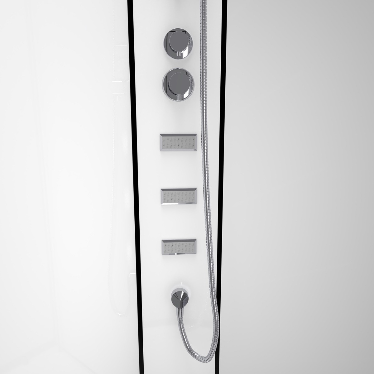 Душевая кабина Loranto Neo CS-21811-100 с низким поддоном, размер 1000х1000х2035 мм, профиль чёрный матовый, стекло прозрачное 5 мм. Задние стенки стеклянные белые. Ширина входа 540 мм.