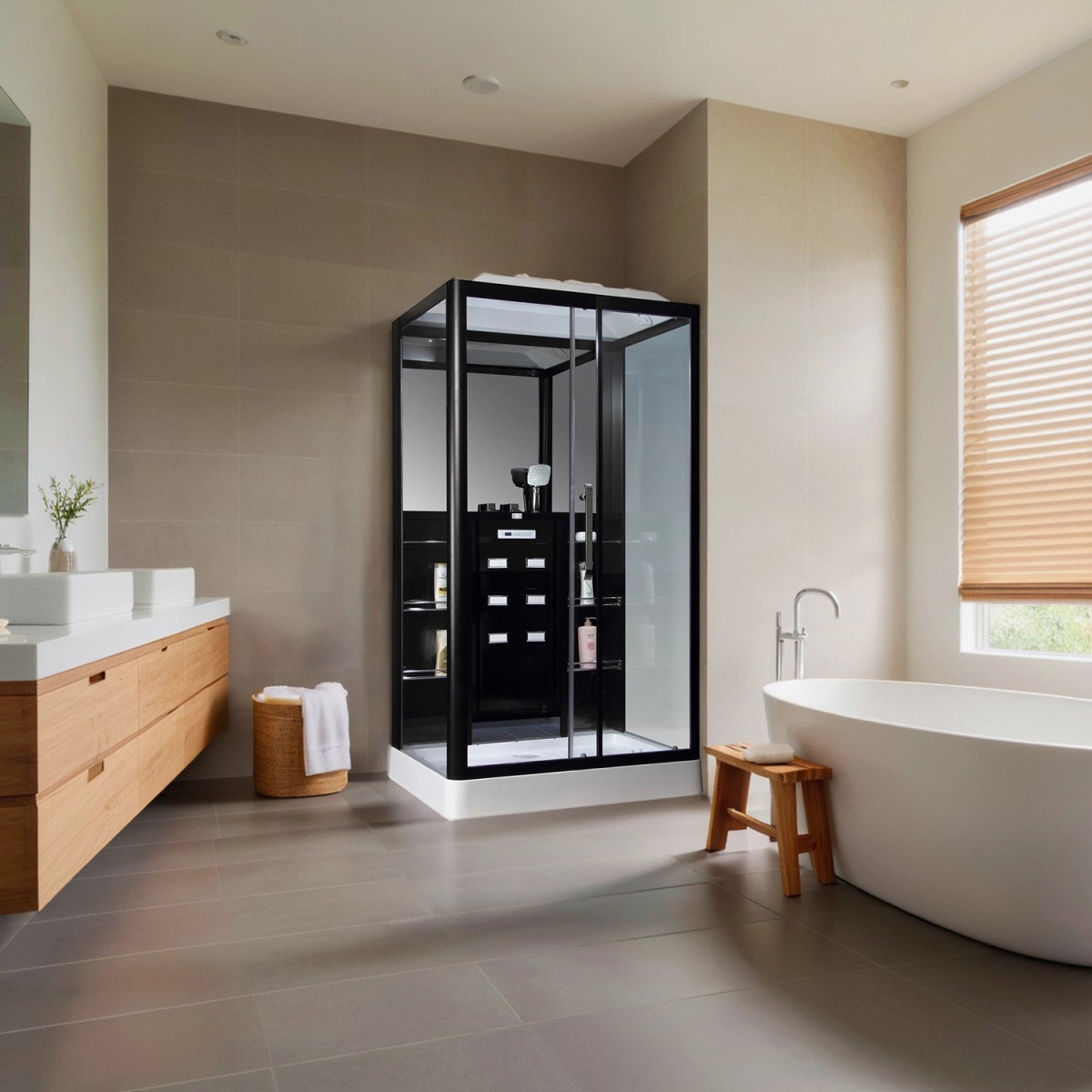 - Алюминиевая рама, Закаленное стекло 6мм, управляется сенсорной панелью, радио, вентилятор, светильник, полка, смеситель 3 режимный кран, массаж ног, крыша с верхним душем, ручная лейка.