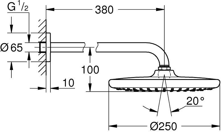 Верхний душ GROHE Tempesta 250 с душевым кронштейном 380 мм, 1 режим струи, хром