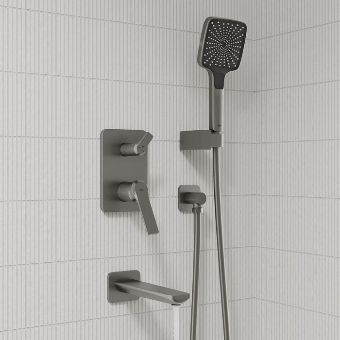 - Встраиваемая душевая система Parker в матовом графите - практичная и стильная, ее дизайн сочетает в себе трендовый минимализм форм и четкие грани.Готовый комплект включает всё необходимое для создания уютного и функционального пространства: смеситель, верхняя лейка с кронштейном для тропического душа, настенный излив, большая ручная лейка с 3 режимами, душевой шланг 1,5 м и выход для подключения шланга с держателем.