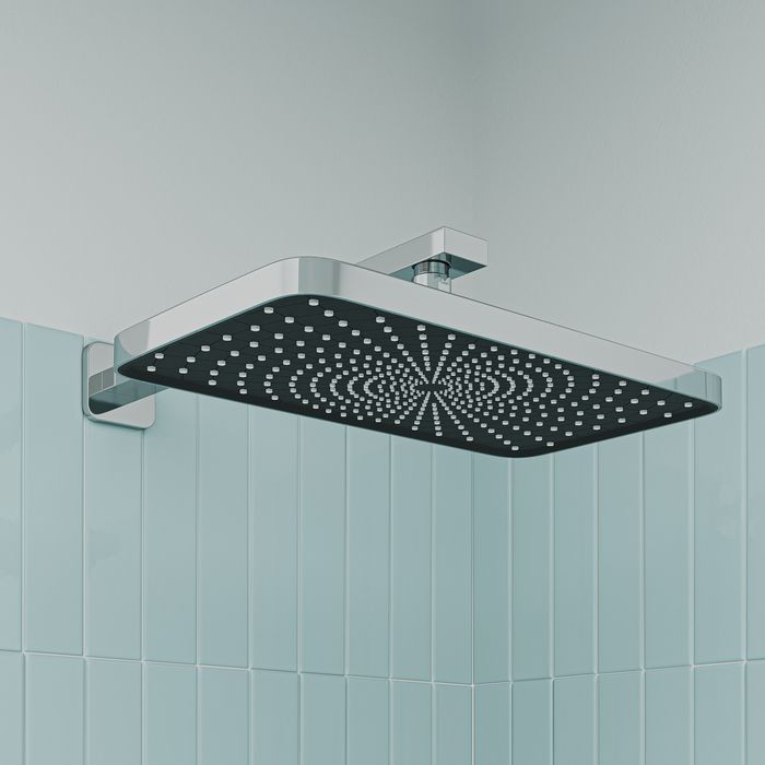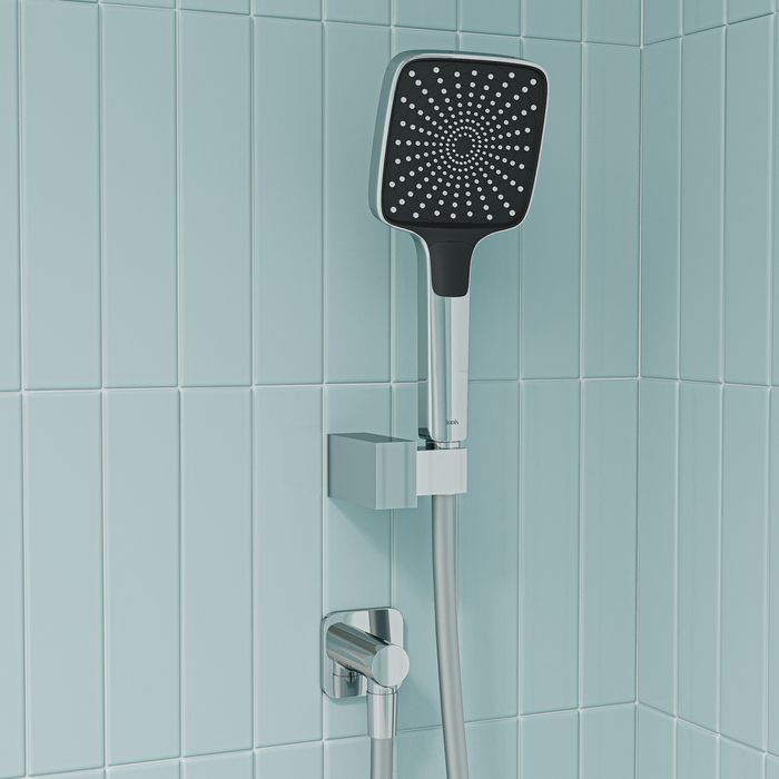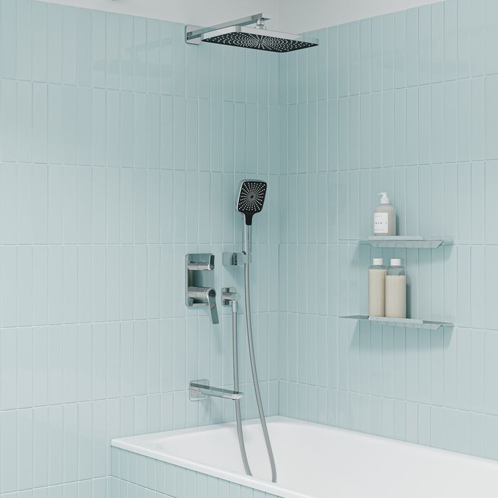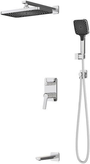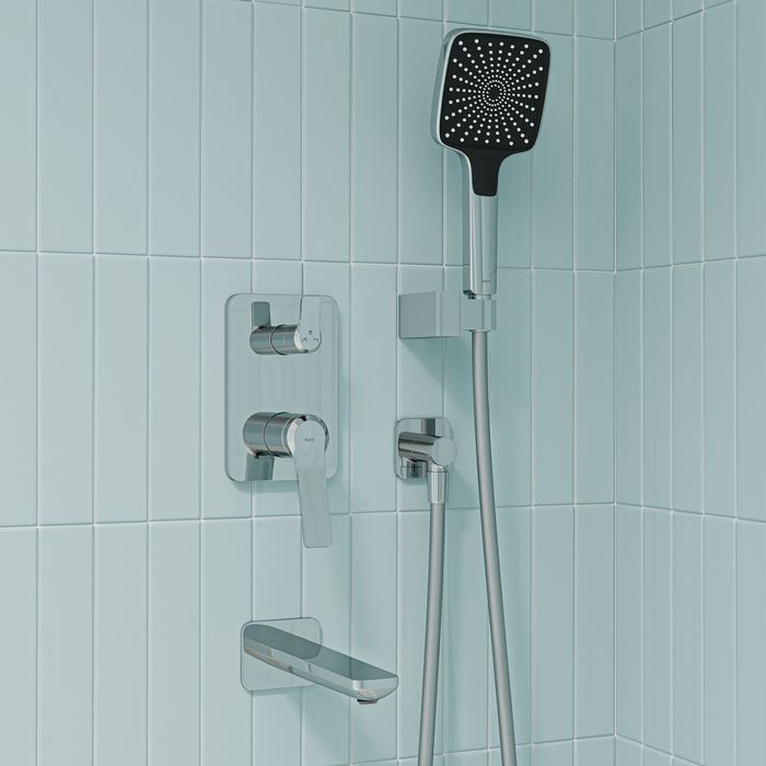 - Внешние элементы душевой системы Parker в универсальном глянцевом хроме с верхним тропическим душем, ручной лейкой и изливом. Предназначены для комплектации встраиваемого смесителя на три выхода UniCore.