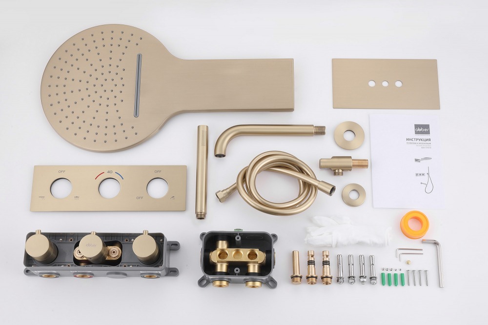 Душевая система для ванны с термостатом Abber Wasser Kreis AF8150G, со скрытой частью в комплекте, материал латунь, цвет золото матовое.