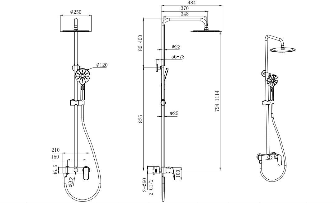 - продуманная функциональность системы регулируемая душевая штанга из нержавеющей стали, выдвигающаяся до 1114 мм в высоту