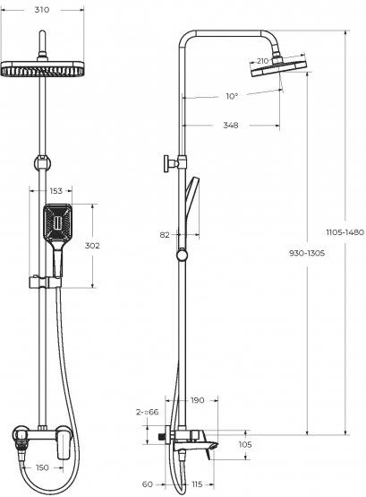 - Оснащение: эксцентрики, душевой шланг ПВХ длиной 150 см, ручной душ 3-х режимный, верхний душ, смеситель с поворотным изливом для ванны и дивертором
