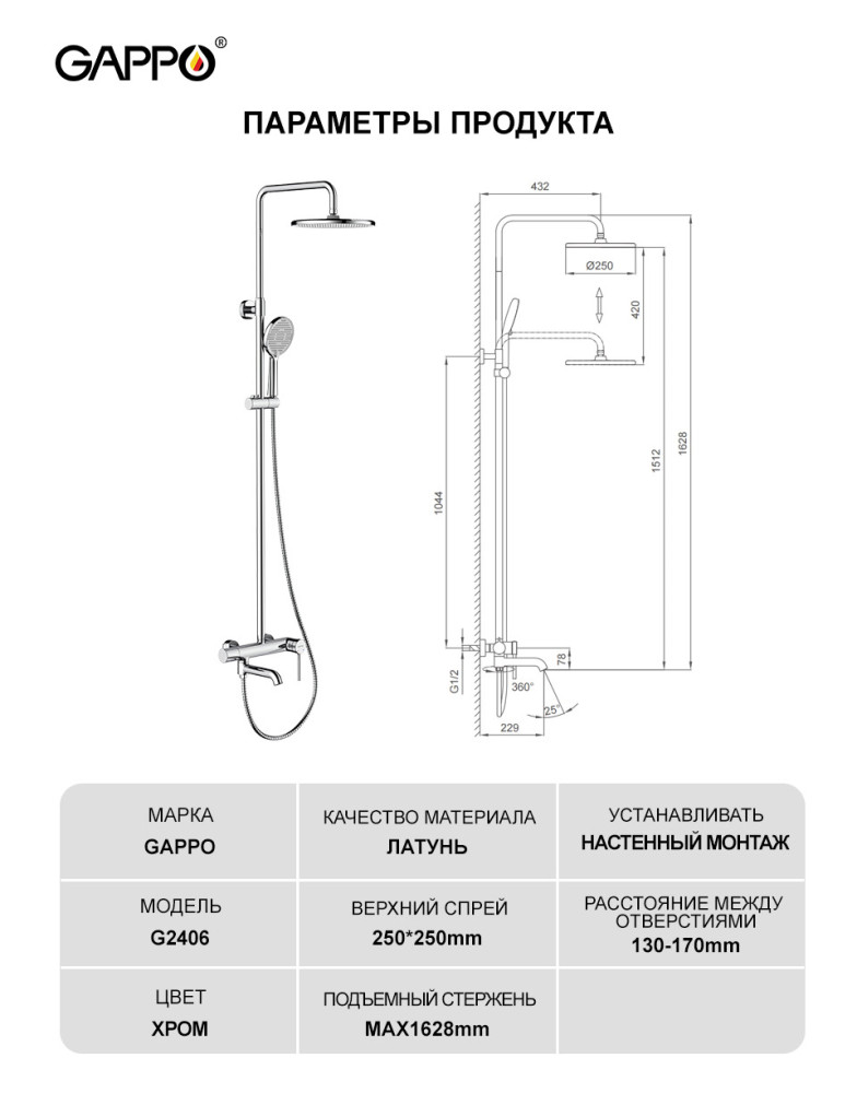 Характеристики душевая система с изливом Gappo (G2406)