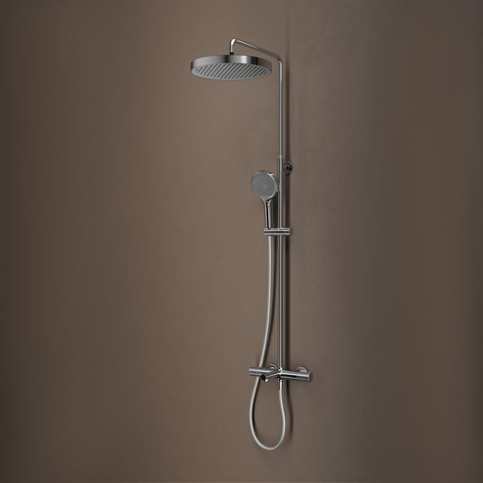 • Душевая система с термостатом, тропическим и ручным душем и изливом Duna – воплощение актуальных трендов в дизайне смесителей в безупречном исполнении: фрезеровка, модные цвета и фактуры.
