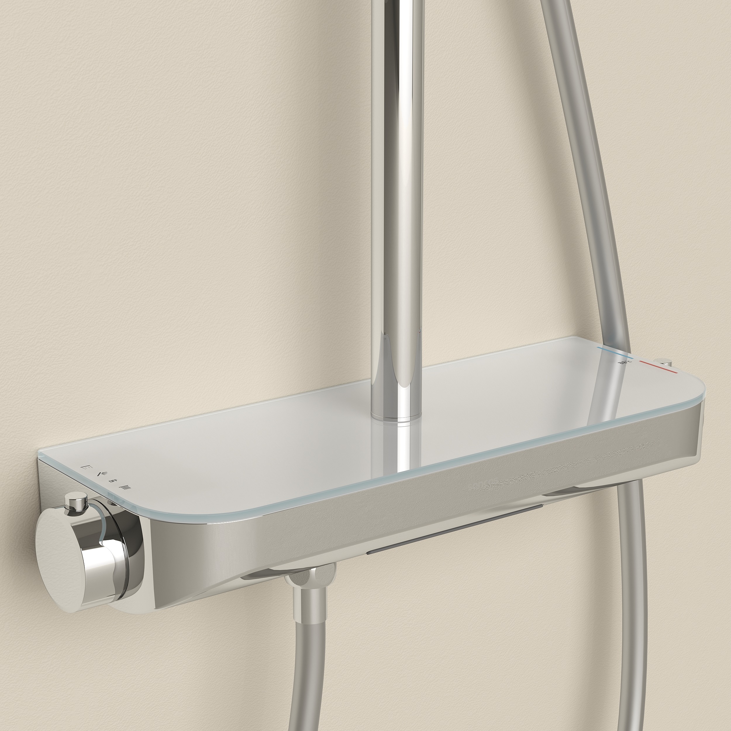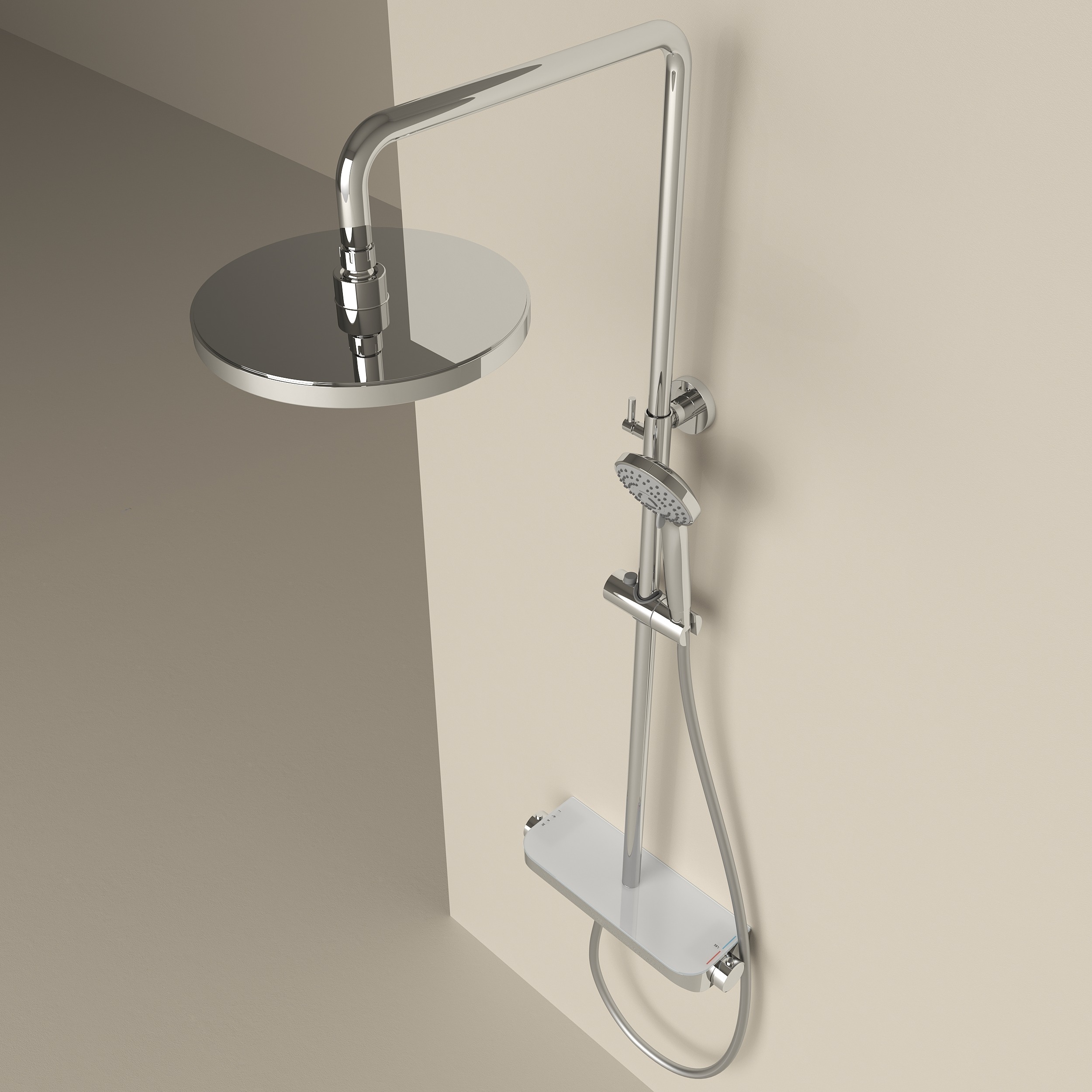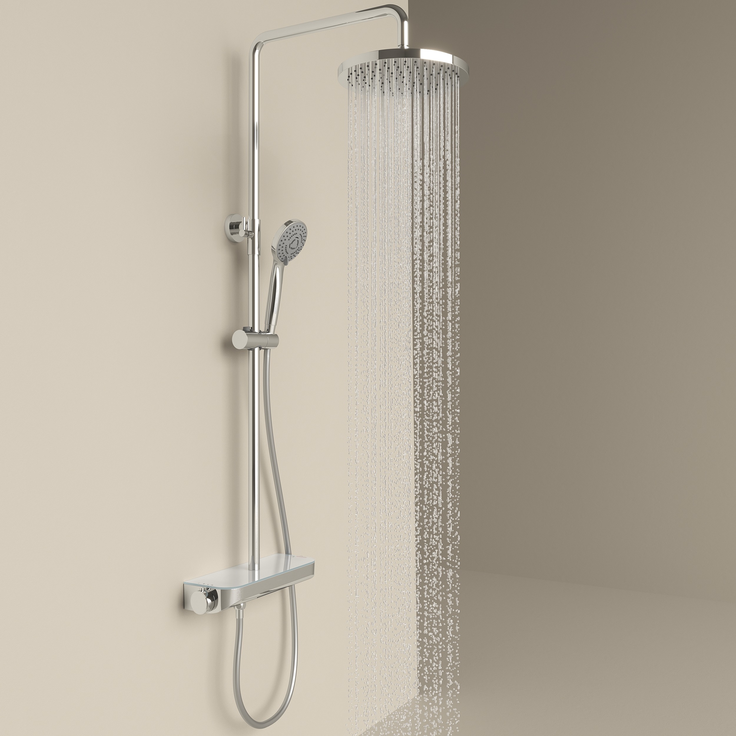 Душевая стойка Sancos Teo SC11002CH с термостатом, изливом и полкой, материал - латунь, цвет - хром.