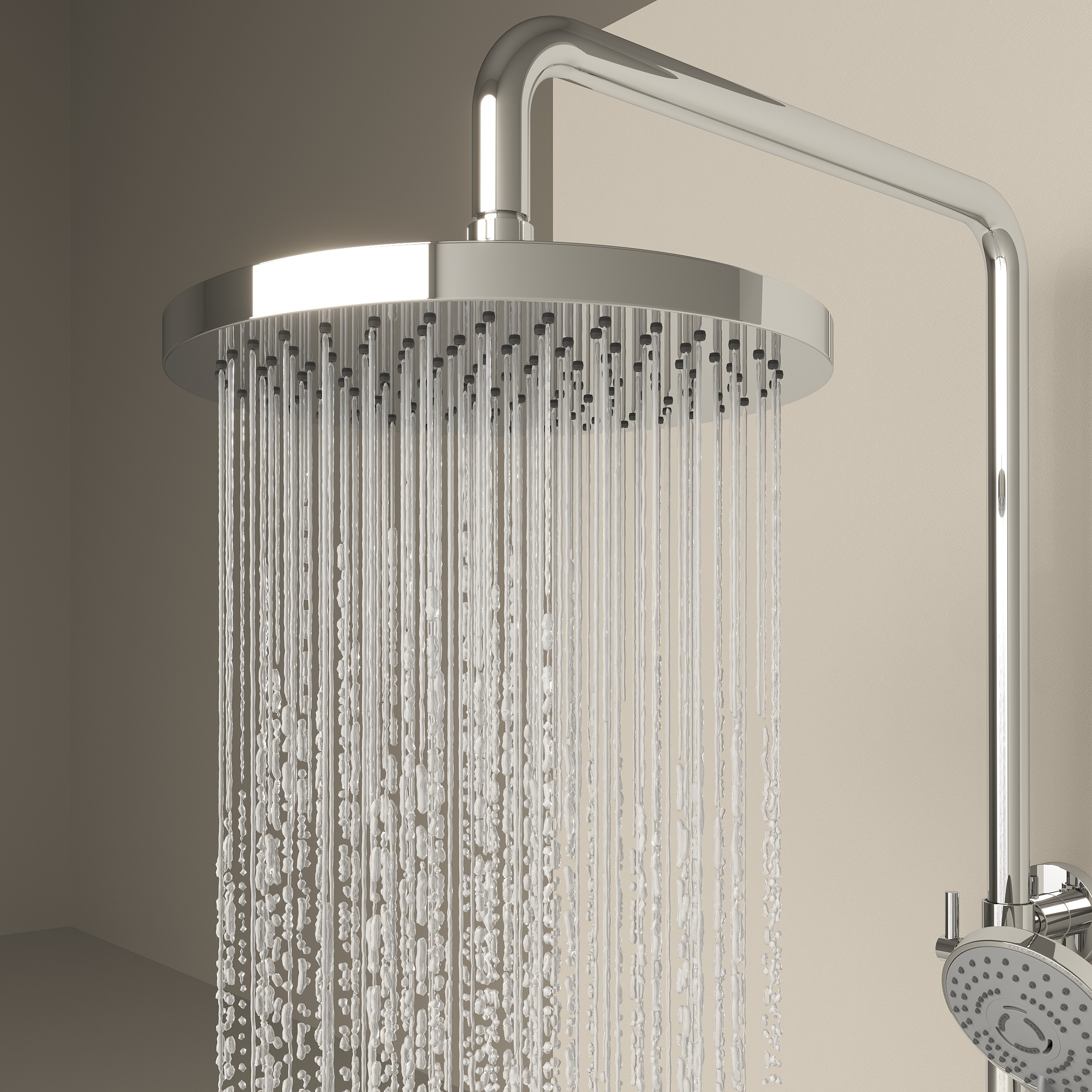 - Верхний душ с регулировкой наклона и мощным потоком с эффектом "тропического дождя"