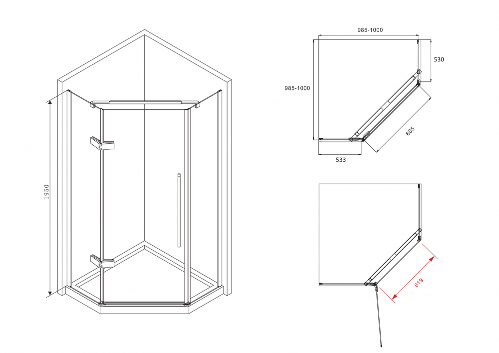 - Монтаж выполняется в угол, поддон приобретается отдельно, что позволяет подобрать подходящую комплектацию. Пятиугольная форма облегчает установку даже в ограниченном пространстве, ширина входа — 619 мм.