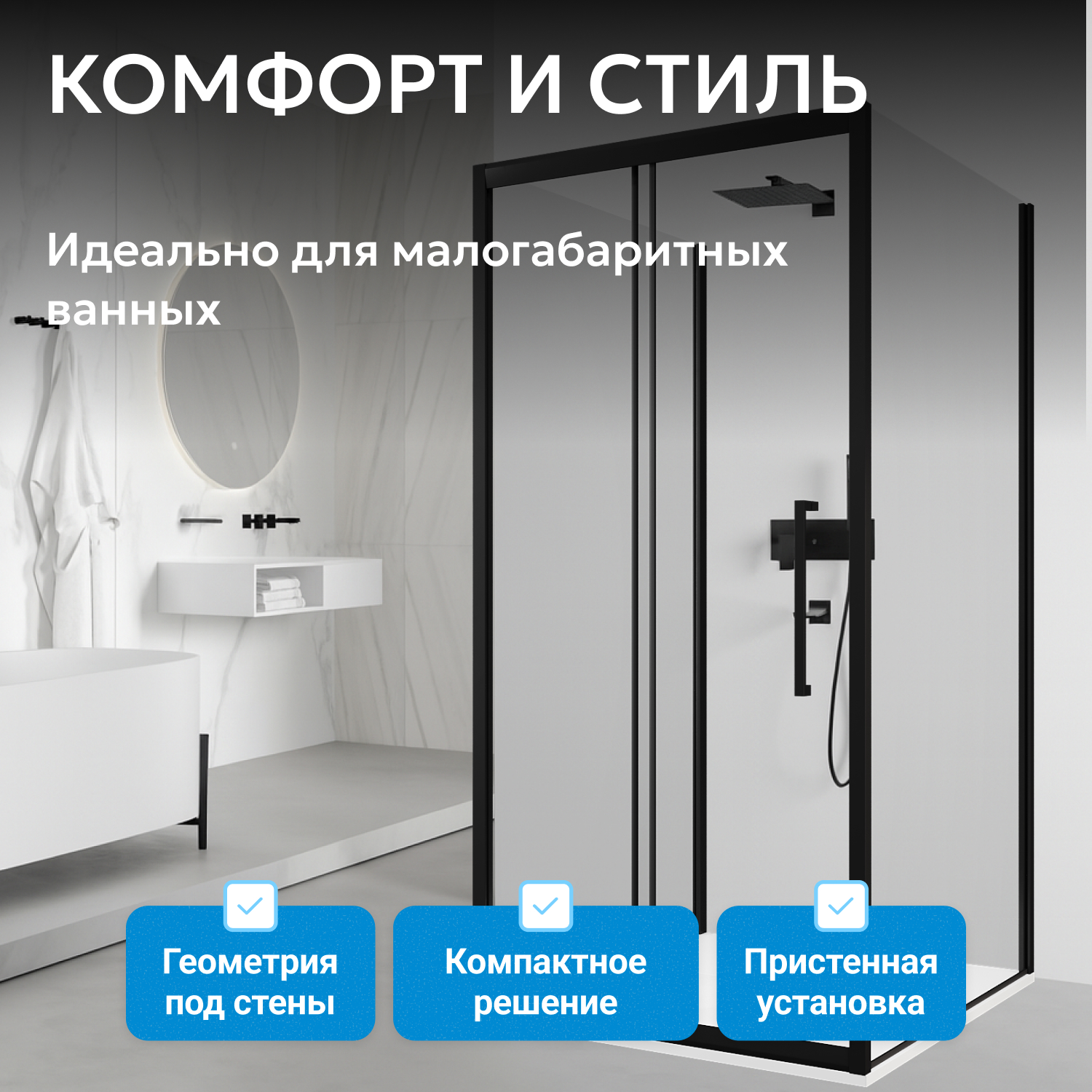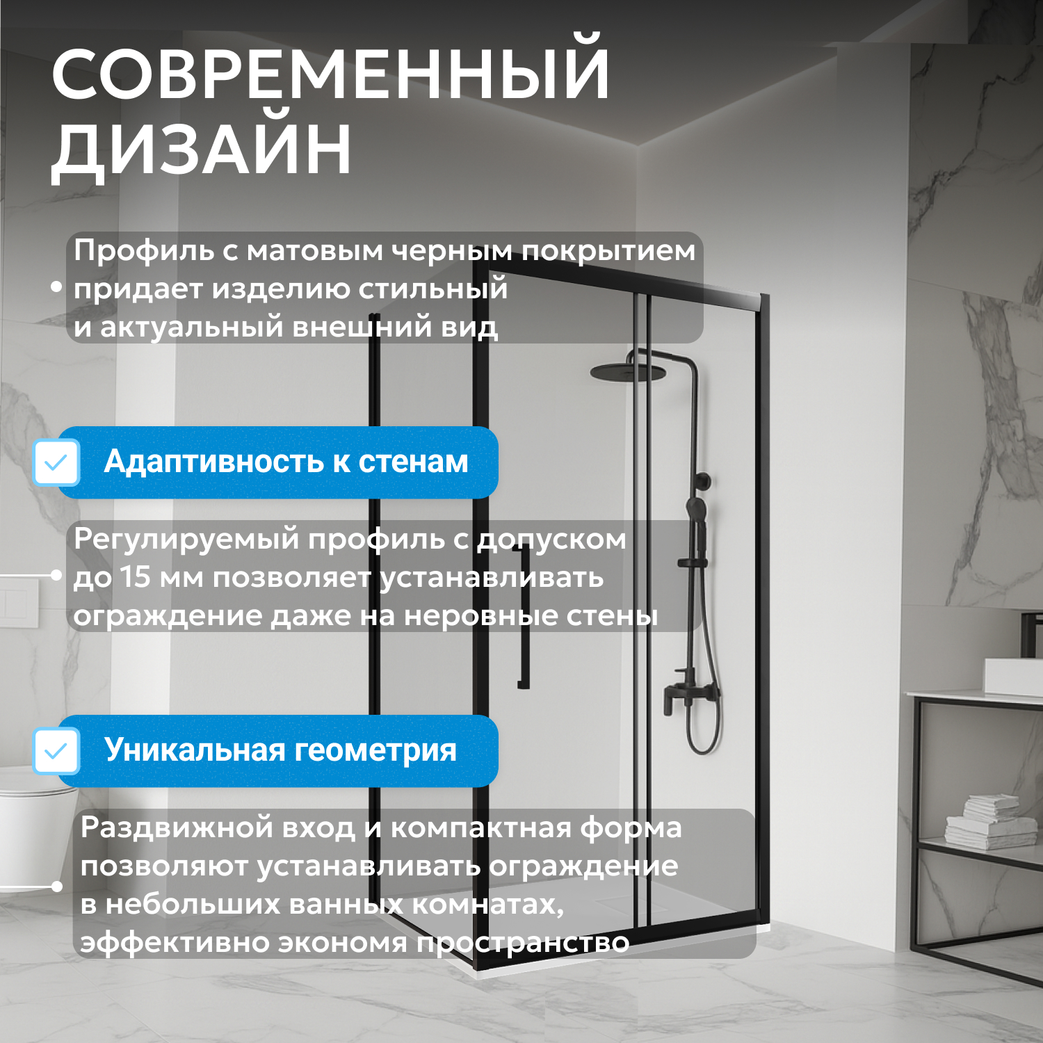 - Прямоугольная форма, чёрный профиль и прозрачное закалённое стекло толщиной 6 мм создают актуальный внешний вид и обеспечивают прочность конструкции.