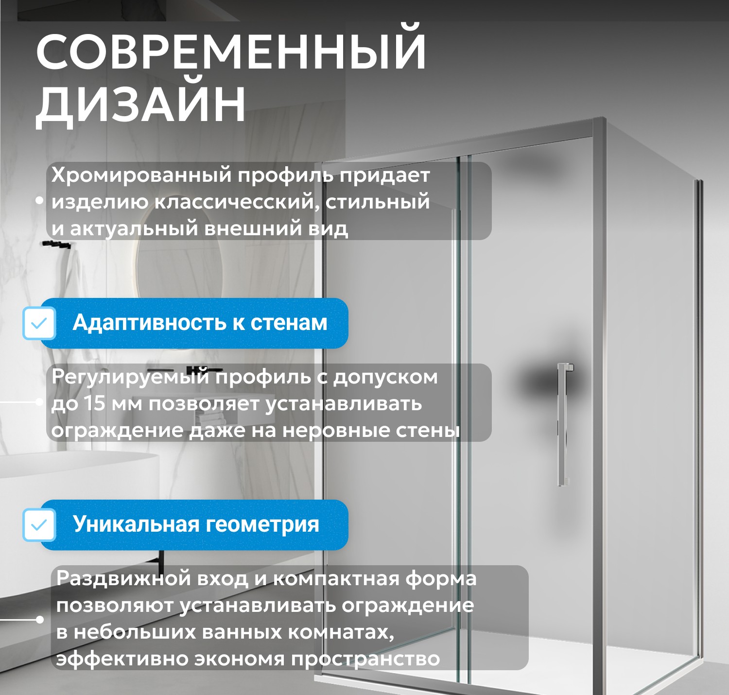- Модель выполнена из матового закаленного стекла толщиной 6 мм с прочным хромированным металлическим профилем. Прямоугольная форма оптимизирует использование пространства, габариты: 100×130×195 см, вес — 109 кг. Раздвижная дверь на двойных роликах открывается плавно и бесшумно. Большая металлическая ручка облегчает эксплуатацию и повышает безопасность при ежедневном использовании.