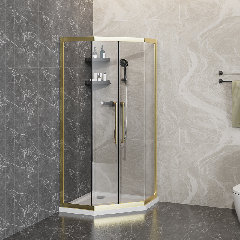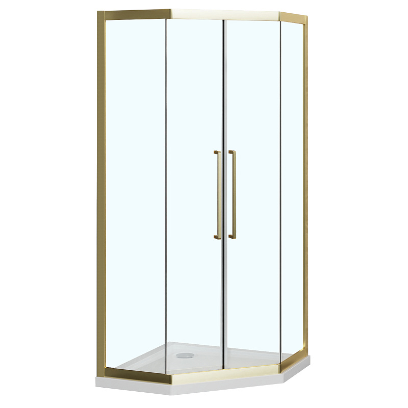 - Пятиугольный душевой уголок, с двумя раздвижными дверьми, на усиленных двойных роликах с нержавеющими подшипниками.