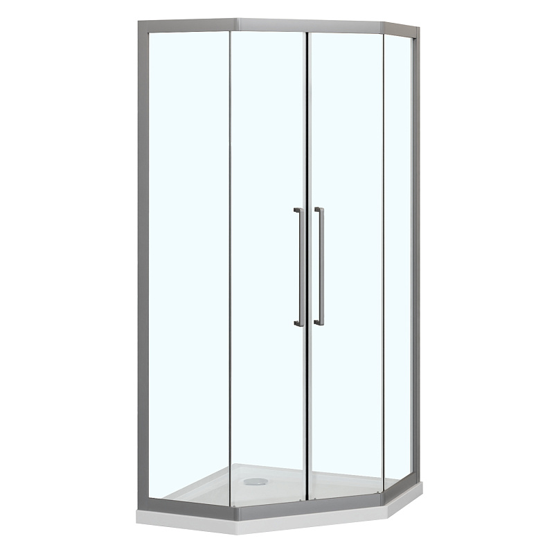 - Пятиугольный душевой уголок, с двумя раздвижными дверьми, на усиленных двойных роликах с нержавеющими подшипниками.
