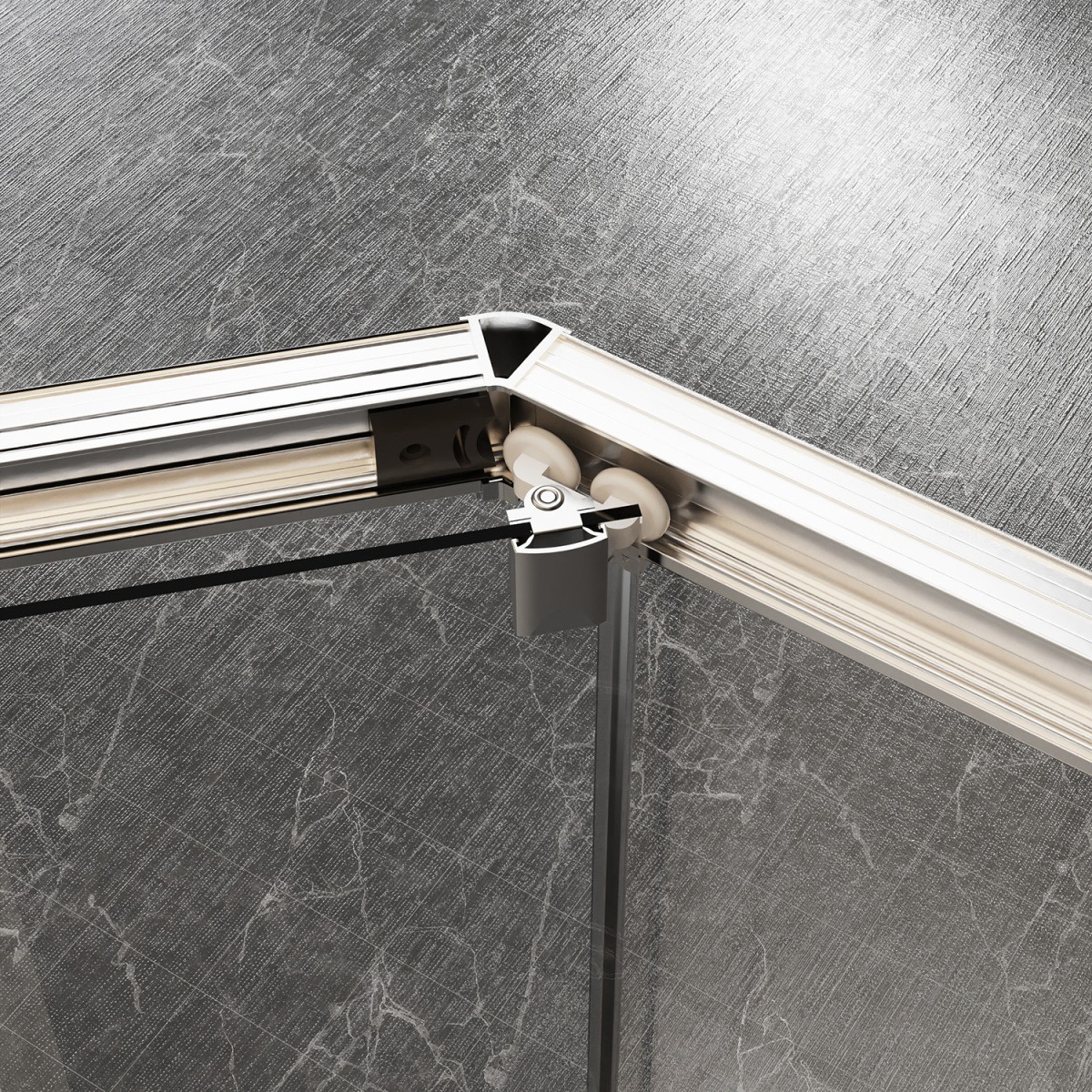 - Пятиугольный душевой уголок, с двумя раздвижными дверьми, на усиленных двойных роликах с нержавеющими подшипниками.