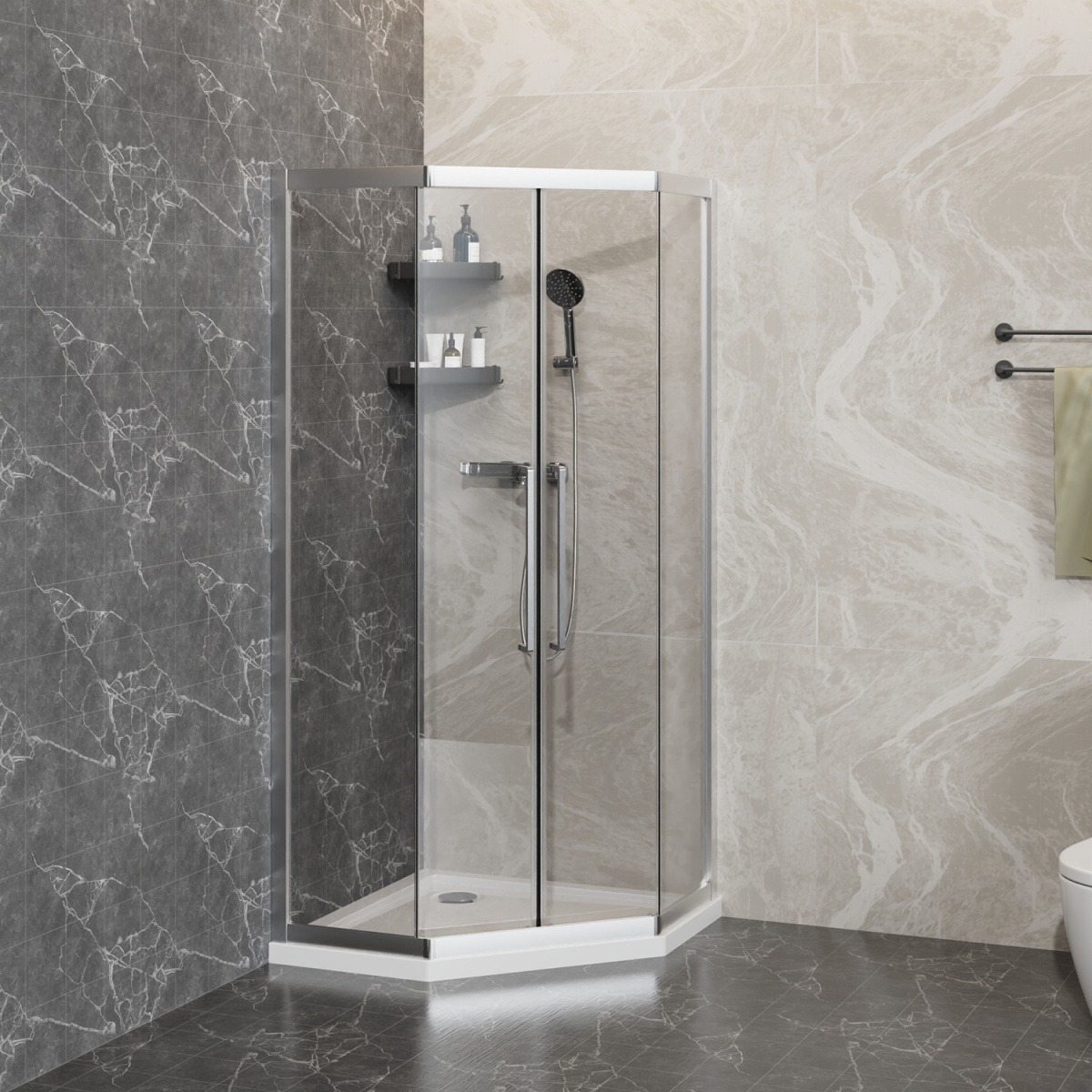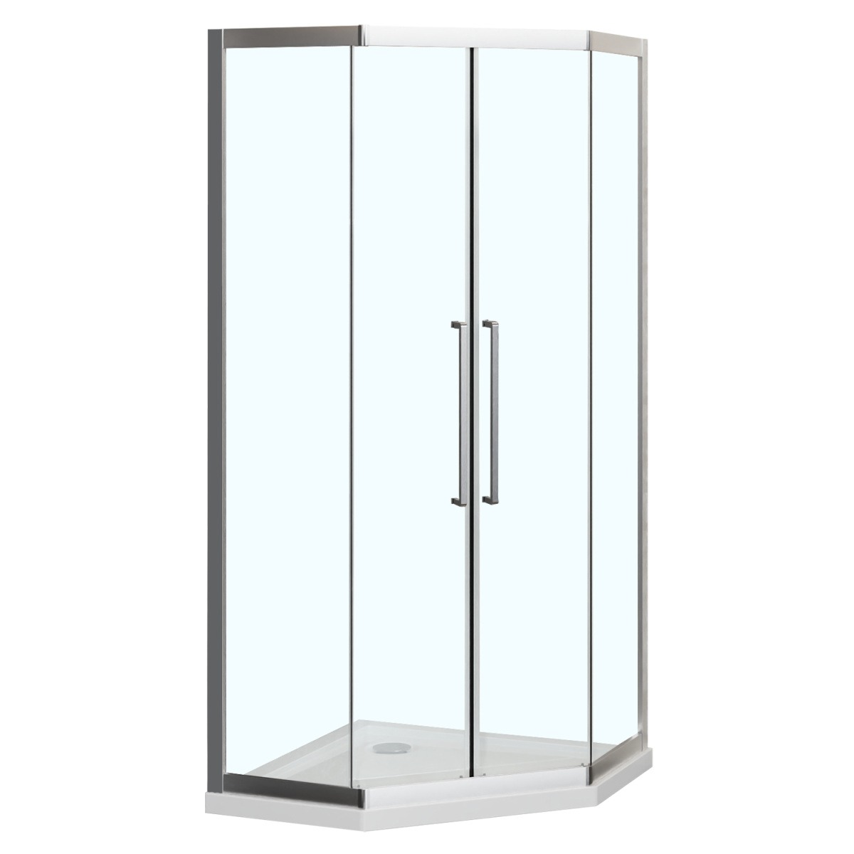 - Пятиугольный душевой уголок, с двумя раздвижными дверьми, на усиленных двойных роликах с нержавеющими подшипниками.