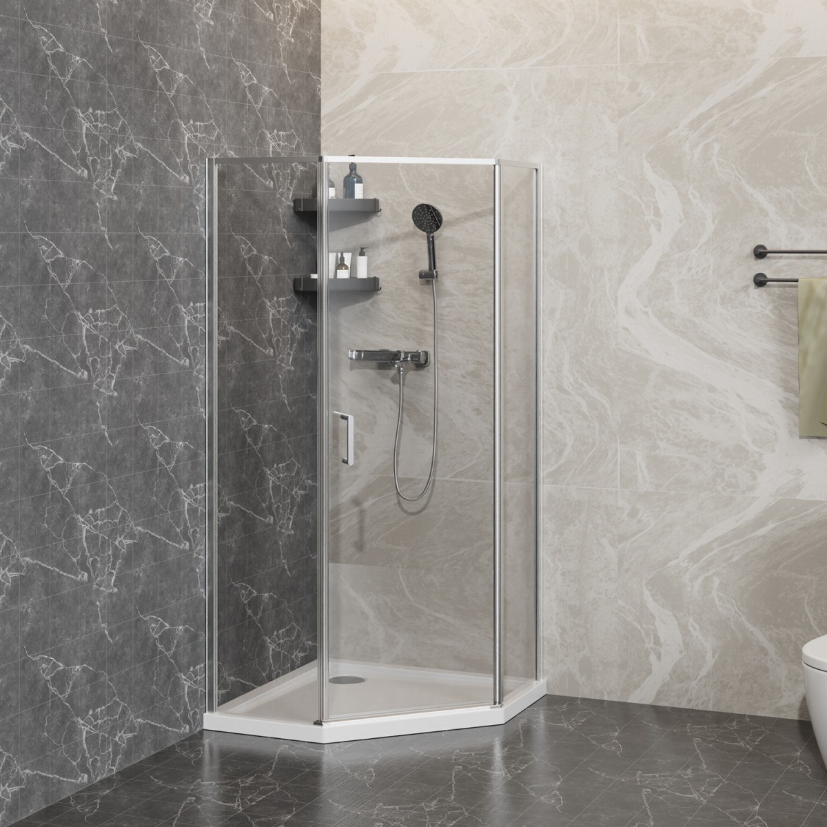- Пятиугольный душевой уголок, с универсальной распашной дверью (L/R), на усиленном механизме микролифт.