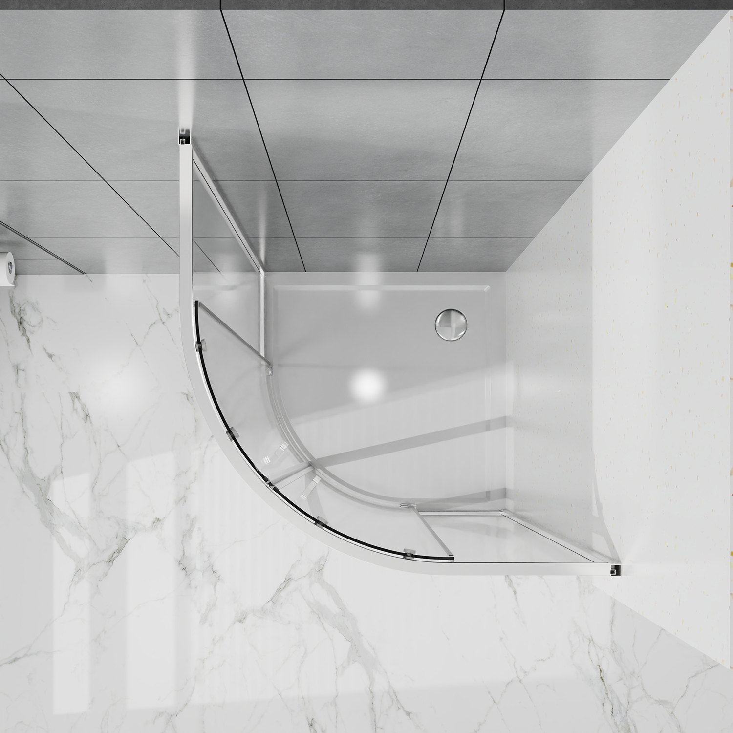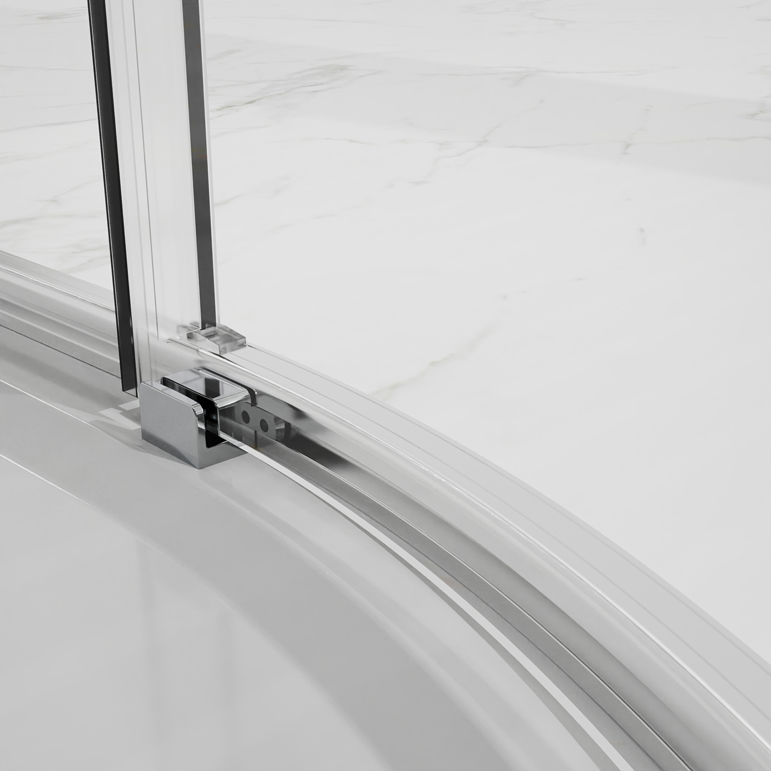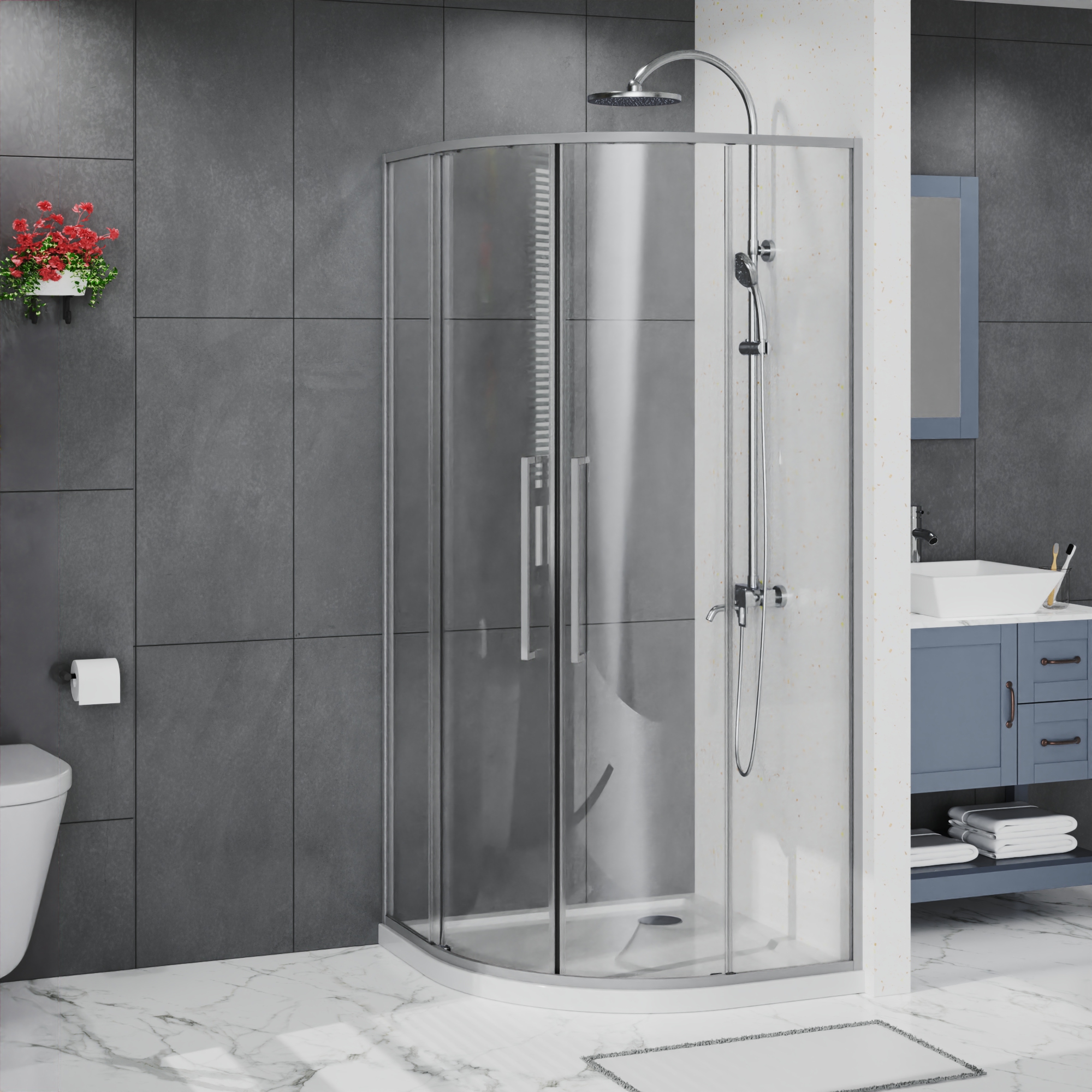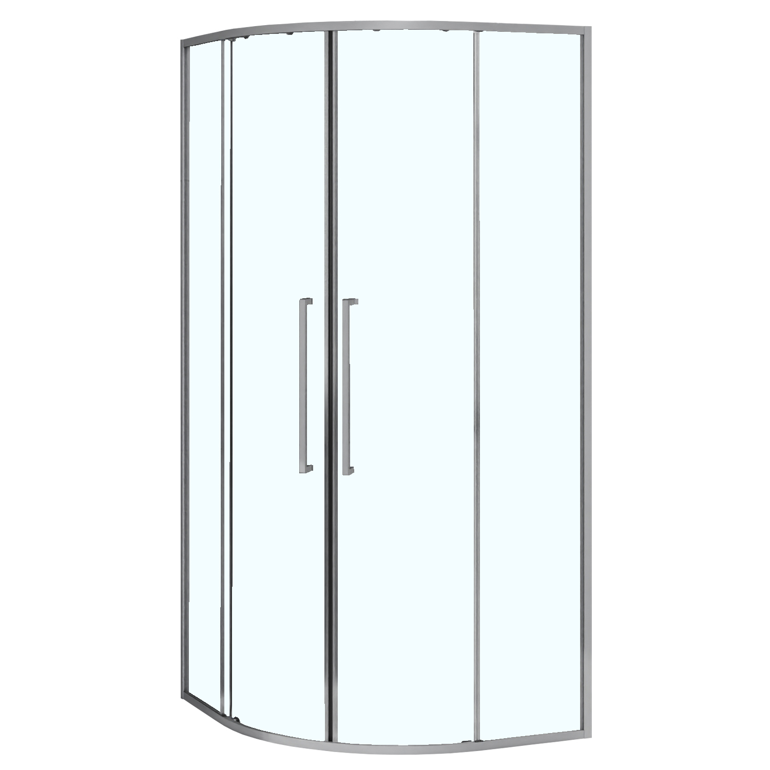 - Радиусный Душевой Уголок 1/4 круга ВХОД С УГЛА, с двумя раздвижными дверьми, на двойных роликах с нержавеющими подшипниками.