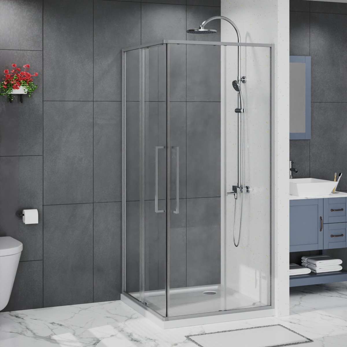 - Душевой Уголок Квадратный, ВХОД С УГЛА, с двумя раздвижными дверьми, на двойных роликах с нержавеющими подшипниками.