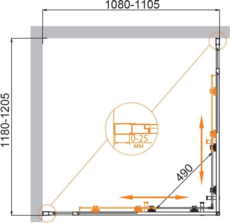 Душевое ограждение Cezares MOLVENO-AH-22-120/110-C-GM-IV, размер 1200x1100x1950 мм, профиль оружейная сталь, стекло прозрачное, поддон приобретается отдельно. Габариты с регулировками (1080-1105)x(1180-1205)x1950 мм, вход 490 мм.