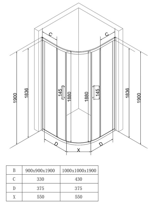 Душевое ограждение EvaGold EG220077 1000х1000х1900 мм, стекло - прозрачное, 5 мм, профиль - оружейная сталь. Ширина входа 550 мм. Поддон приобретается отдельно.