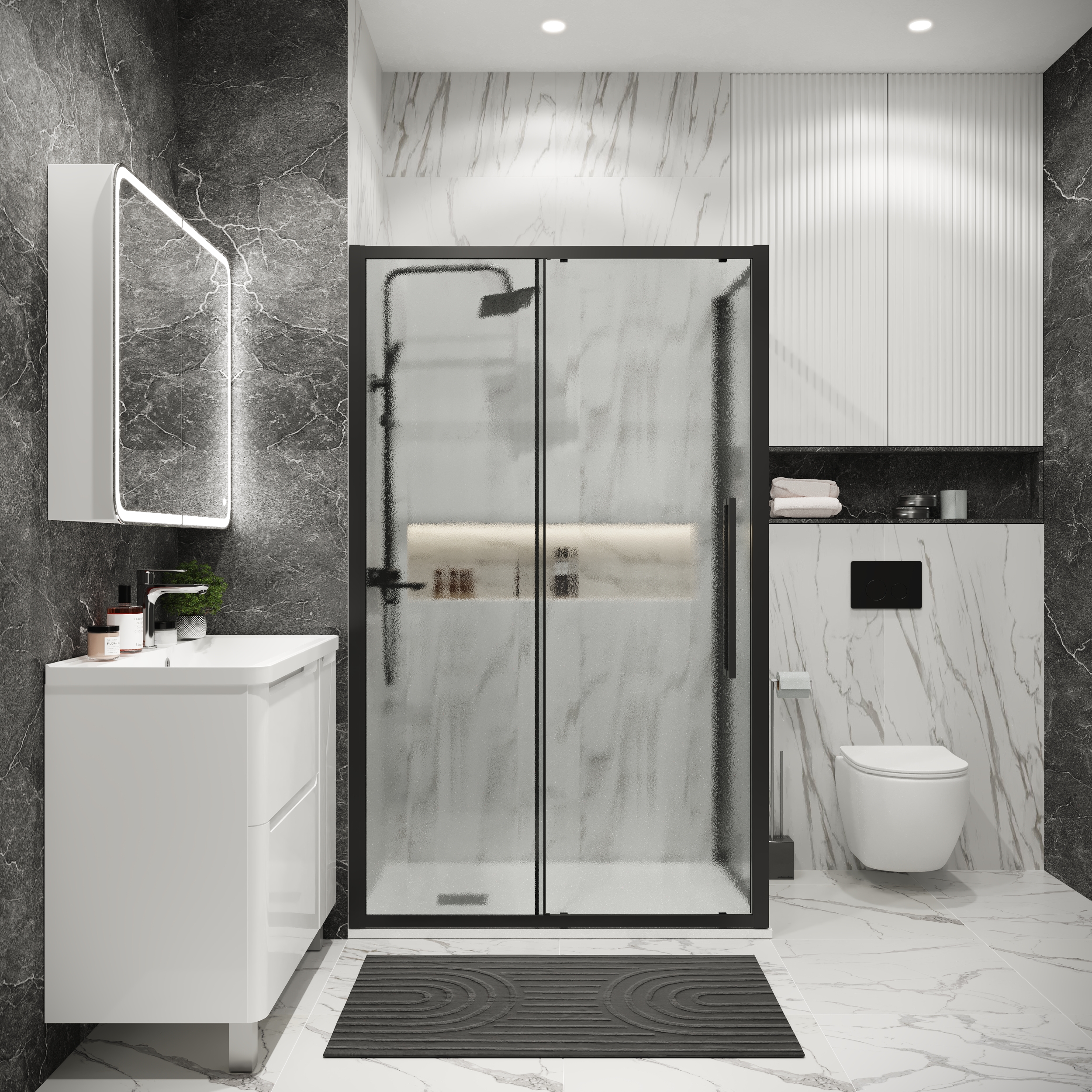 Душевое ограждение Grossman Cosmo 120.K33.02.1210.21.02, размер 1200х1000х1950 мм, профиль чёрный, стекло шиншилла 6 мм. Ширина входа 494 мм. Диапазон регулировок 118-121х98,5-100х195 см.