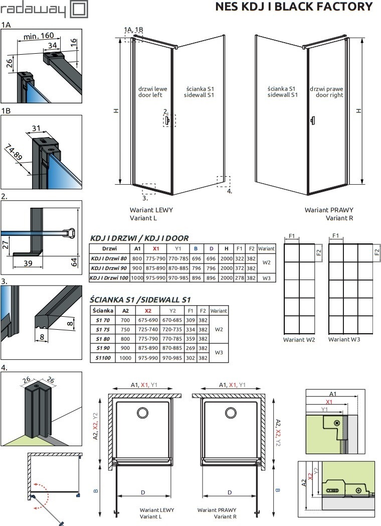 Душевое ограждение Radaway Nes Black KDJ I Factory + S1 1000х800х2000 мм. Профиль - черный, стекло - прозрачное с черной решеткой из керамической краски, 6 мм. Поддон приобретается отдельно.