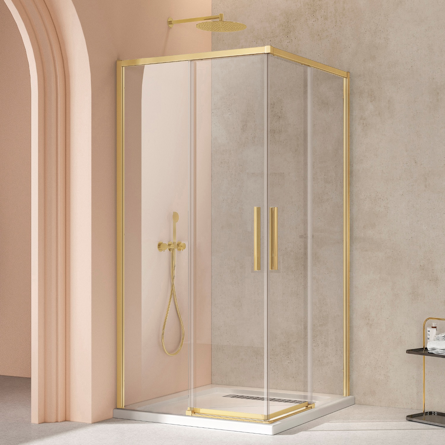 Душевое ограждение Vincea Slim VSS-4SL100CLG, размер 1000х1000х1950 мм, профиль - брашированное золото, стекло - прозрачное 8 мм с покрытием Easy Clean, ширина входа - 438 мм, габариты с диапазоном регулировок: 985-1000 x 985-1000 мм. Поддон приобретается отдельно.