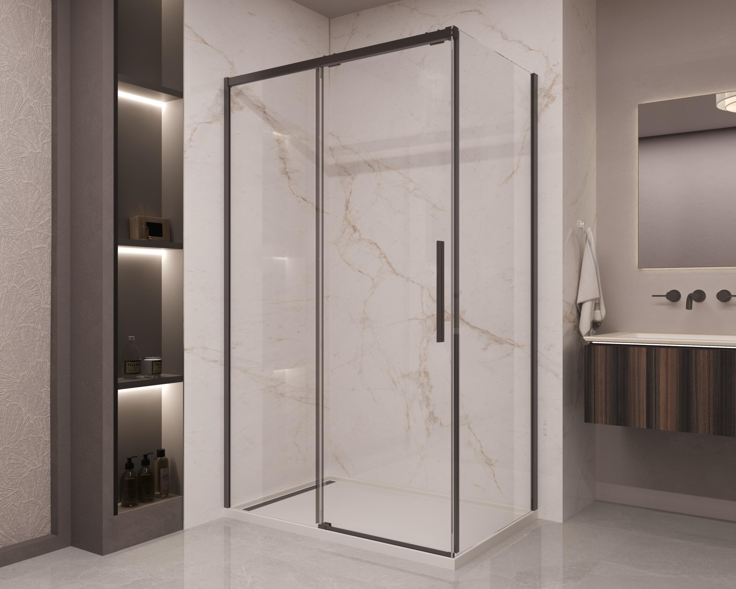 Душевое ограждение Vincea Stella VSR-1ST9012CLB, размер 1200x900x2000 мм, профиль чёрный, стекло прозрачное 8 мм, ширина входа 495-505 мм, габариты регулировки (1195-1215)x(880-900)x2000 мм. Дверь 120 см, душевая стенка 90 см. Поддон приобретается отдельно.