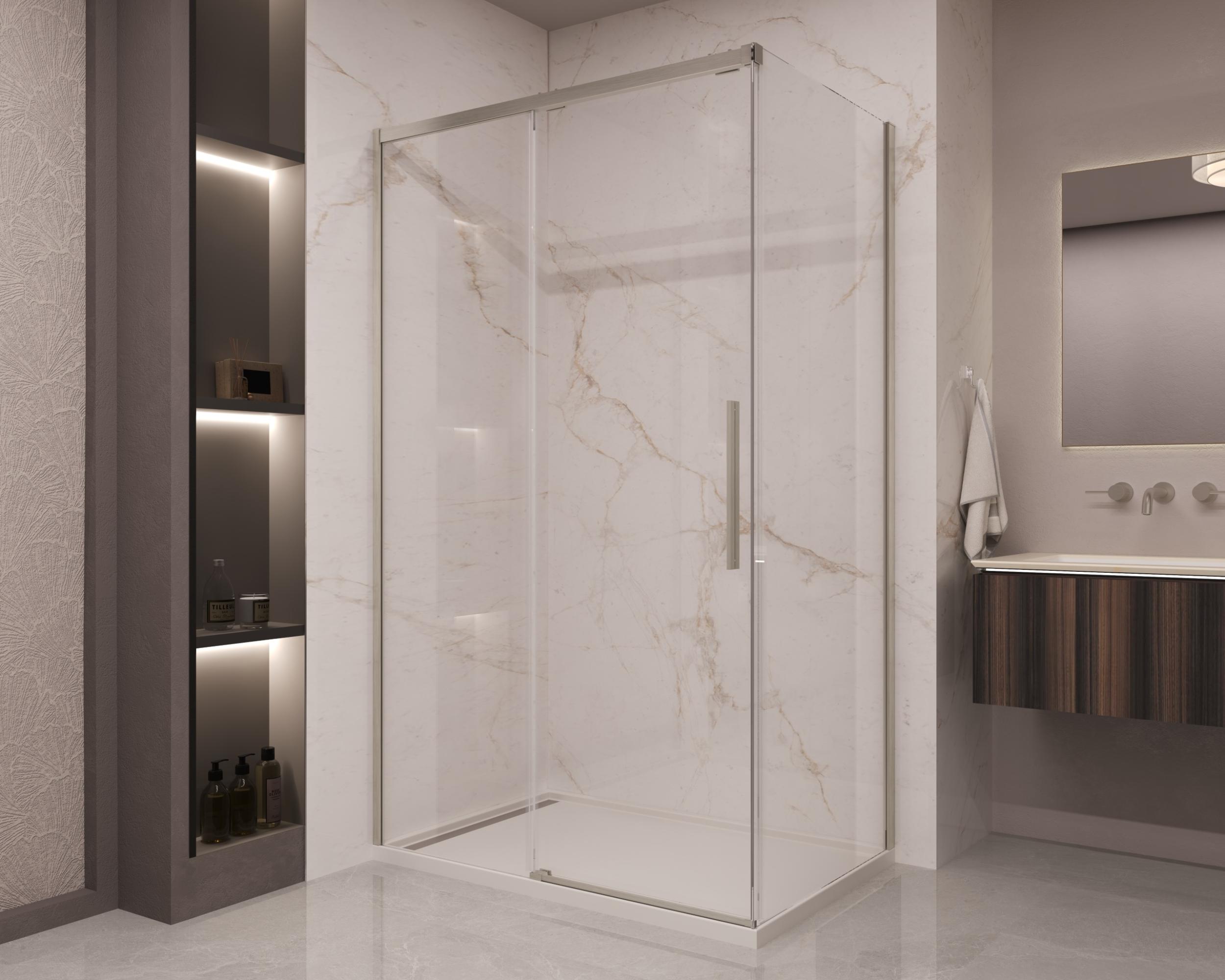 Душевое ограждение Vincea Stella VSR-1ST9012CLBN, размер 1200x900x2000 мм, профиль брашированный никель, стекло прозрачное 8 мм с покрытием Easy Clean, доводчики закрывания двери, ручка 430мм, ширина входа 495-505 мм, габариты регулировки (1195-1215)x(880-900)x2000 мм. Дверь 120 см, душевая стенка 90 см. Поддон приобретается отдельно.
