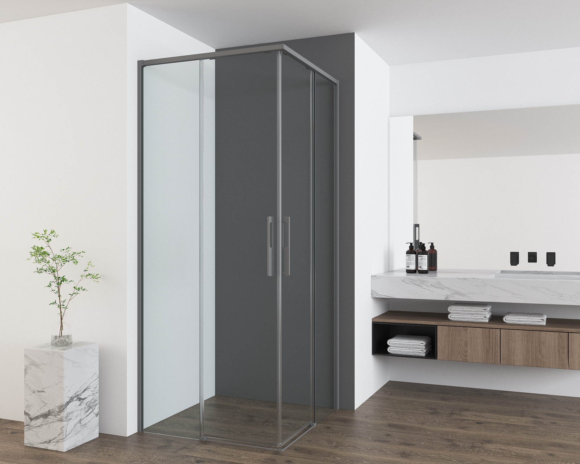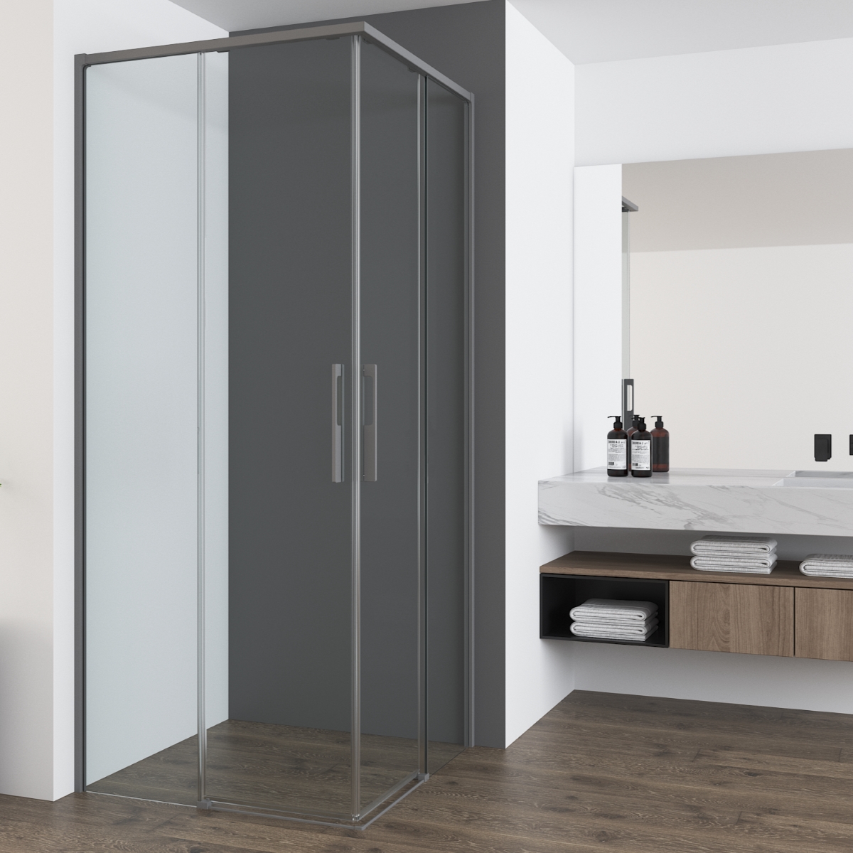 Душевое ограждение Vincea Ultima VSS-7UL9090CLGM, размер 900x900x2000 мм, профиль вороненая сталь, стекло прозрачное 8 мм, ширина входа 515 мм, габариты регулировки (895-905)x(895-905)x2000 мм. Поддон приобретается отдельно.