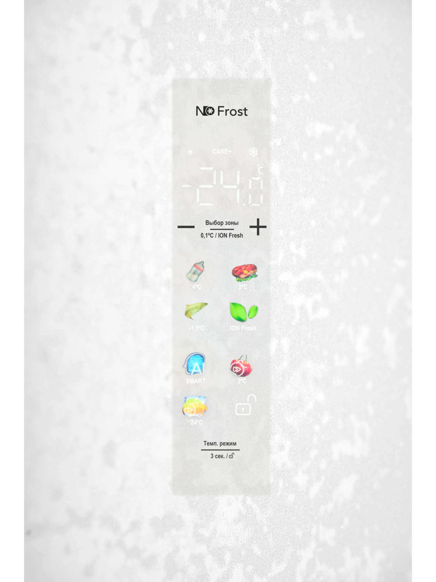 - Режим SMART сохраняет свежесть продуктов, используя оптимальные показатели для эффективного энергопотребления: 5°С – в холодильном отделении, -18°С – в морозильной камере и 4°С – в зоне с настраиваемой температурой CARE+SPACE.