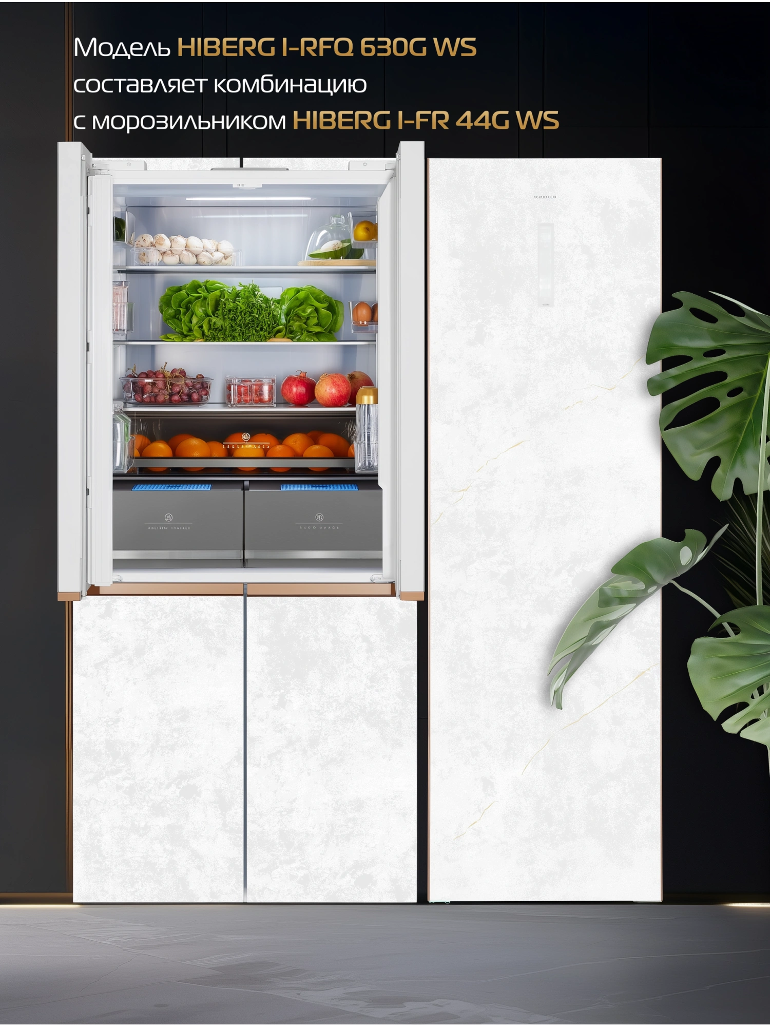 - Холодильник HIBERG i-RFQ 630G WS и морозильник HIBERG i-FR 44G WS выполнены в едином FAMILY-дизайне, что позволяет им формировать гармоничный тандем и создавать визуально цельную, технологичную кухонную зону. Обе модели оформлены в стеклянных фасадах цвета белого мрамора, дополнены интегрированными металлическими ручками и цветными сенсорными дисплеями. Такая стилистическая синхронность подчёркивает характер бренда HIBERG и делает интерьер современным, лаконичным и удобным в повседневном использовании.