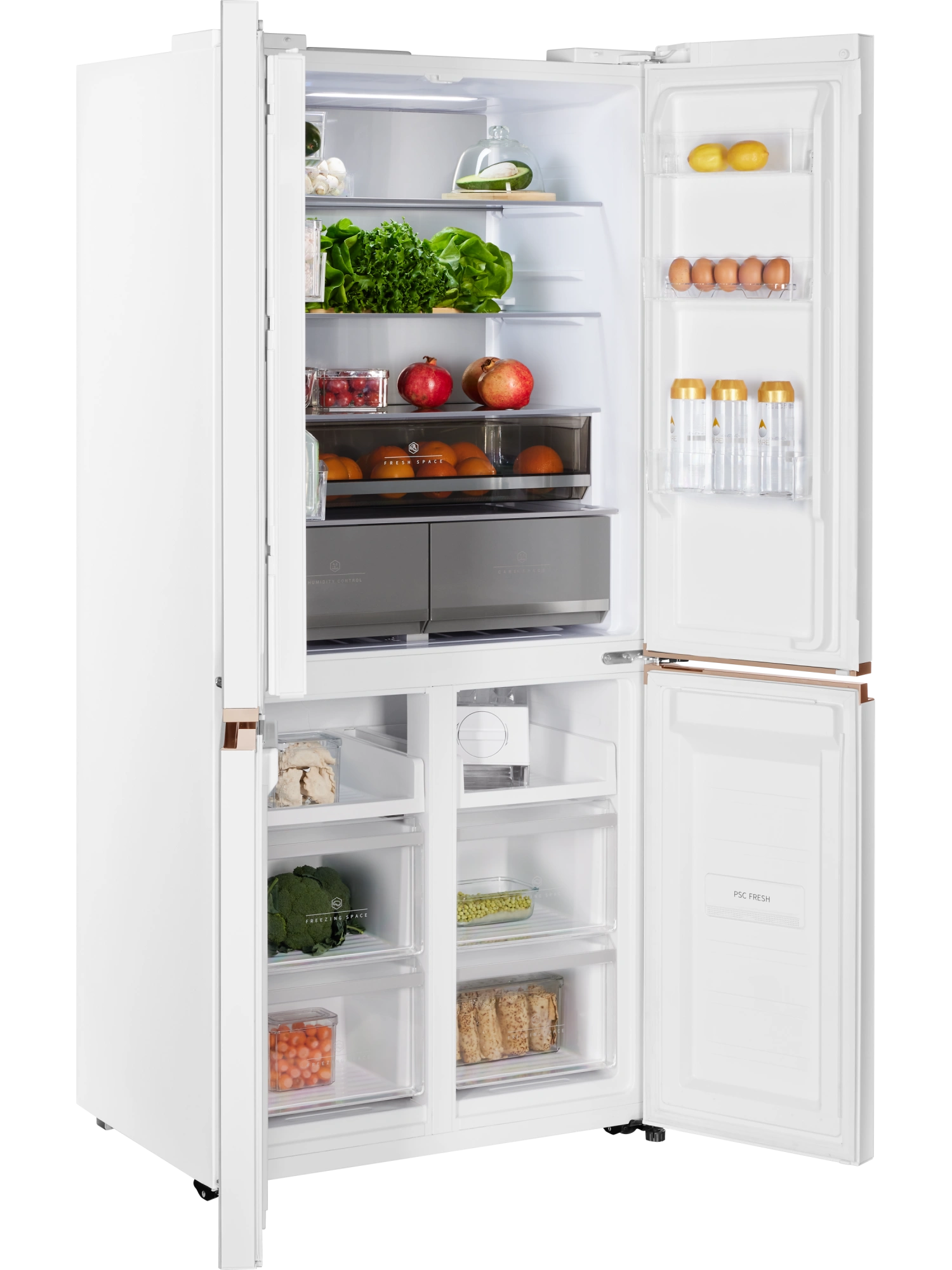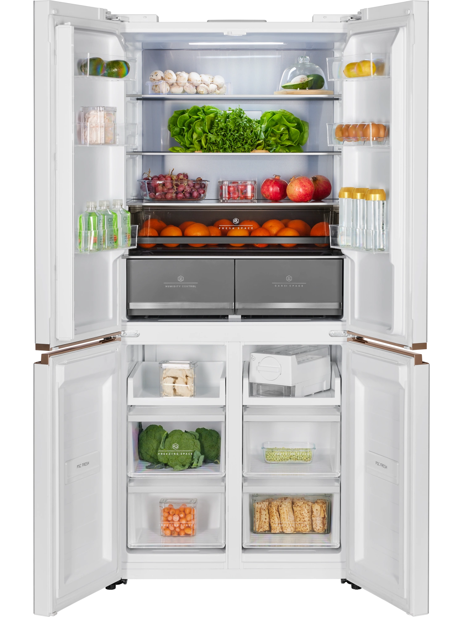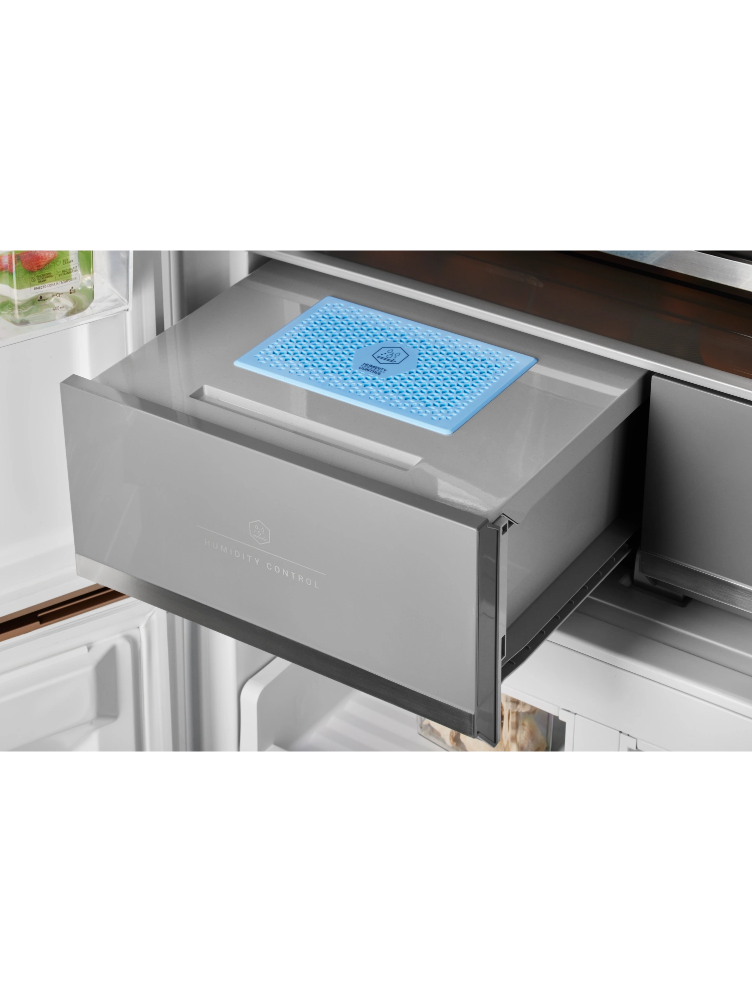 - Ящик CARE+SPACE с индивидуальной зоной охлаждения предназначен для хранения продуктов в нескольких режимах: «морепродукты» при температуре -1,5°С, «мясо» с показателем 2°С и «детское питание, фрукты» с температурой 4°С. Установленная в ящике мембрана поддерживает нужный для каждого из режимов уровень влажности. Выдвижное отделение для овощей и фруктов также оборудовано мембраной для удержания влаги внутри зоны, при этом не препятствует движению воздуха. Выдвижные крышки обоих ящиков обеспечивают дополнительную герметичность емкостей.