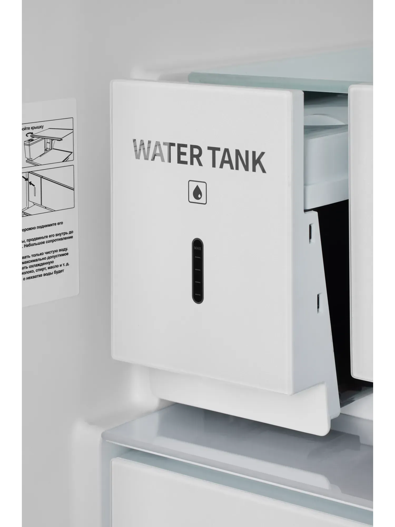 - В структуру морозильной камеры интегрирован автоматический ледогенератор, не требующий подключения к водопроводу. Вода заливается вручную во встроенный резервуар объемом 1,6 литра — и вы всегда получаете свежий лед в любое время. Готовый лед автоматически поступает в контейнер для сбора (лопатка в комплекте).