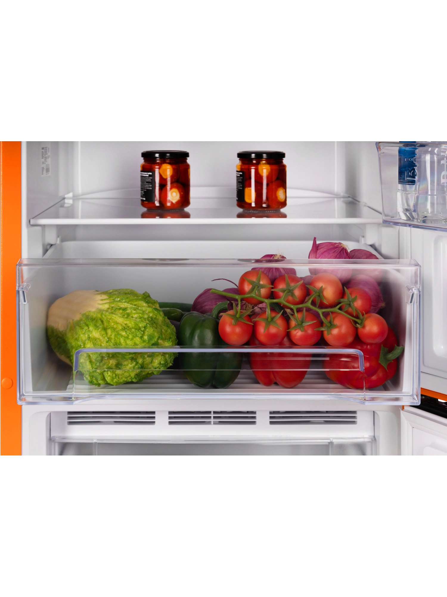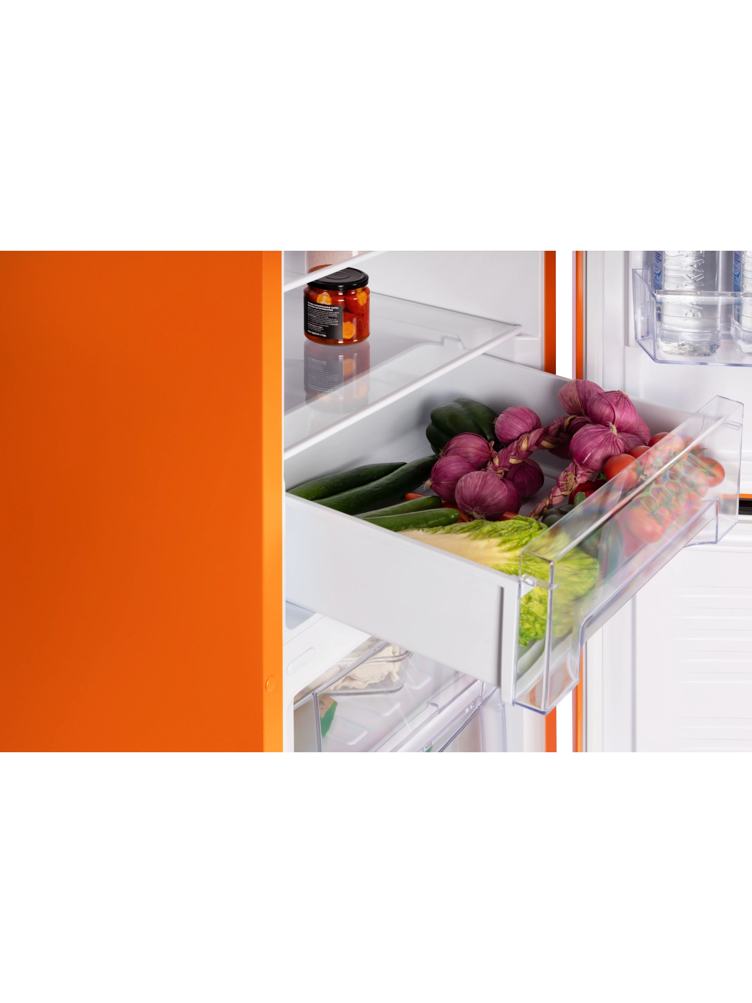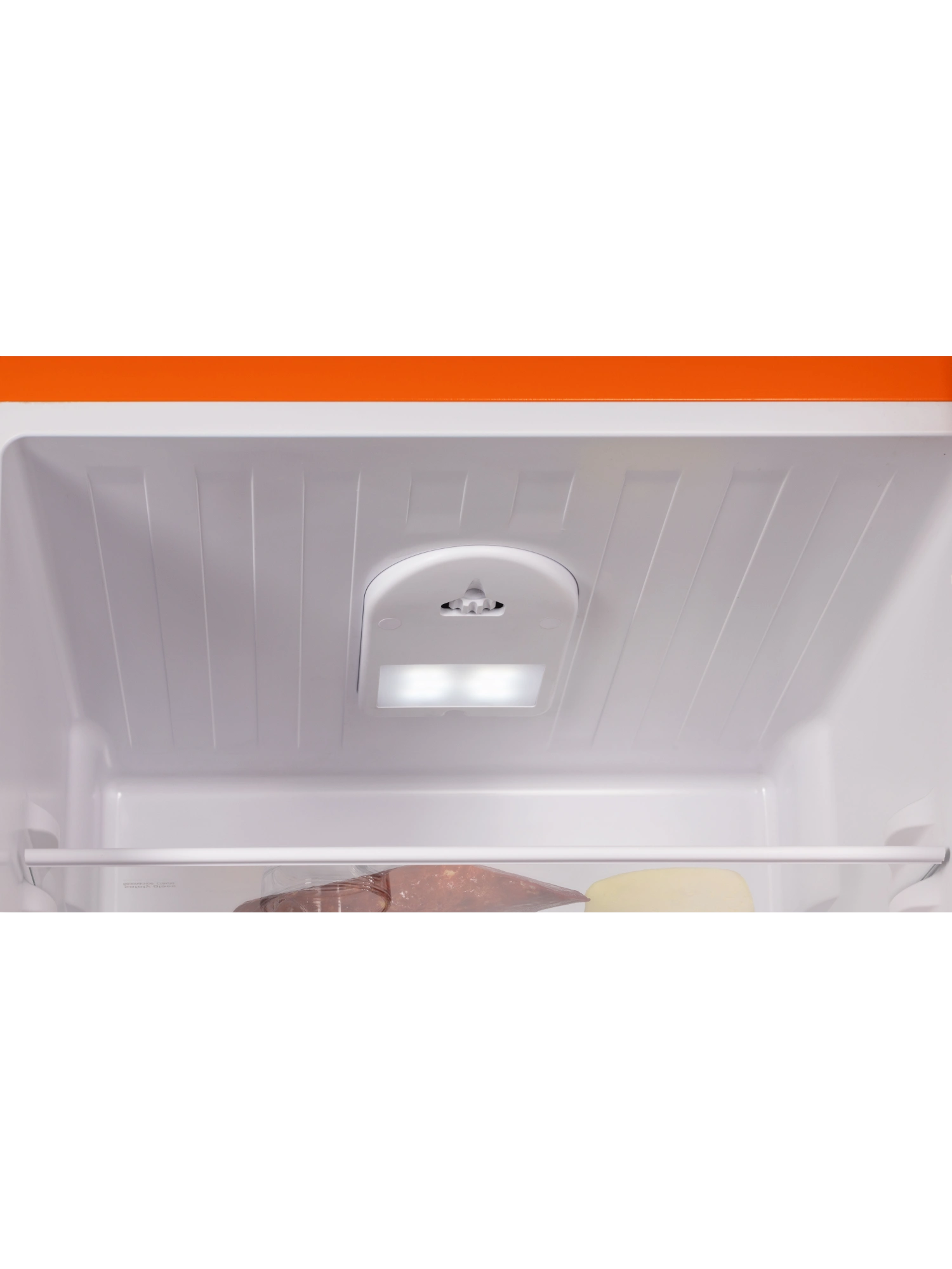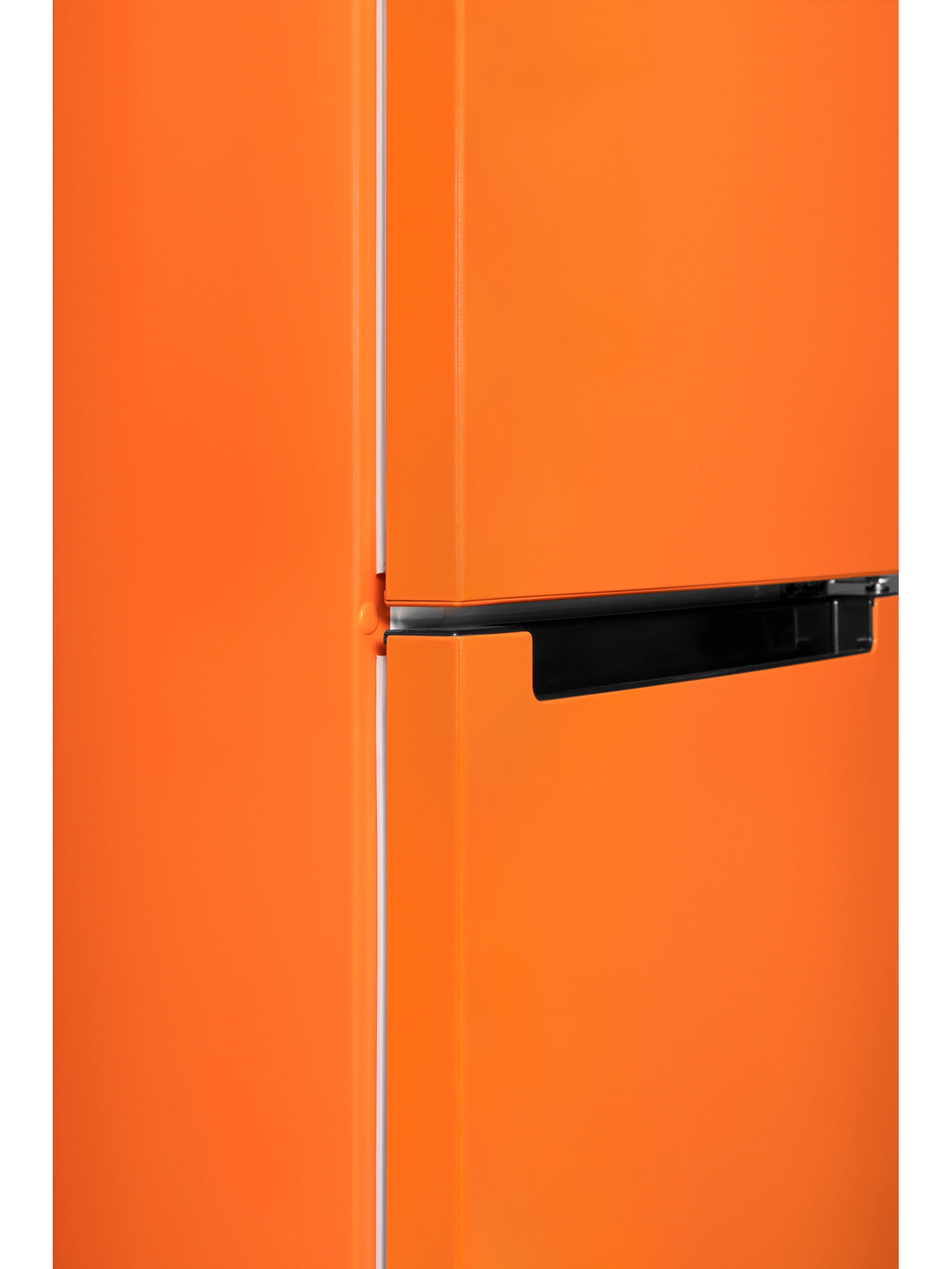 - Устройство объемом 240 литров вмещает продукты для всей семьи. Модель оранжевого матового цвета дополнена интегрированными горизонтальными ручками, которые не нарушают общую эстетику и придают устройству аккуратный, современный облик.