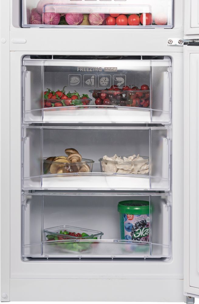 - 3 прозрачных и вместительных ящика в морозильном отделении, где можно длительно хранить большие куски мяса, курицу целиком и другие объемные замороженные продукты;