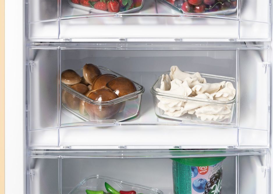 - 3 прозрачных ящика в морозильном отделении позволяют поместить и длительно хранить большие куски мяса, курицу, полуфабрикаты и другие объемные замороженные продукты;