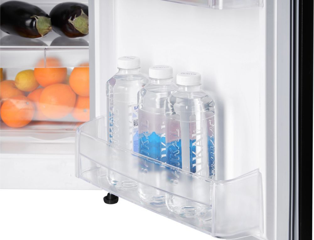 Дверь с интегрированной горизонтальной ручкой имеет возможность перенавешивания на другую сторону для комфортного открывания и установки холодильника в удобном месте. Цвет модели черный матовый
