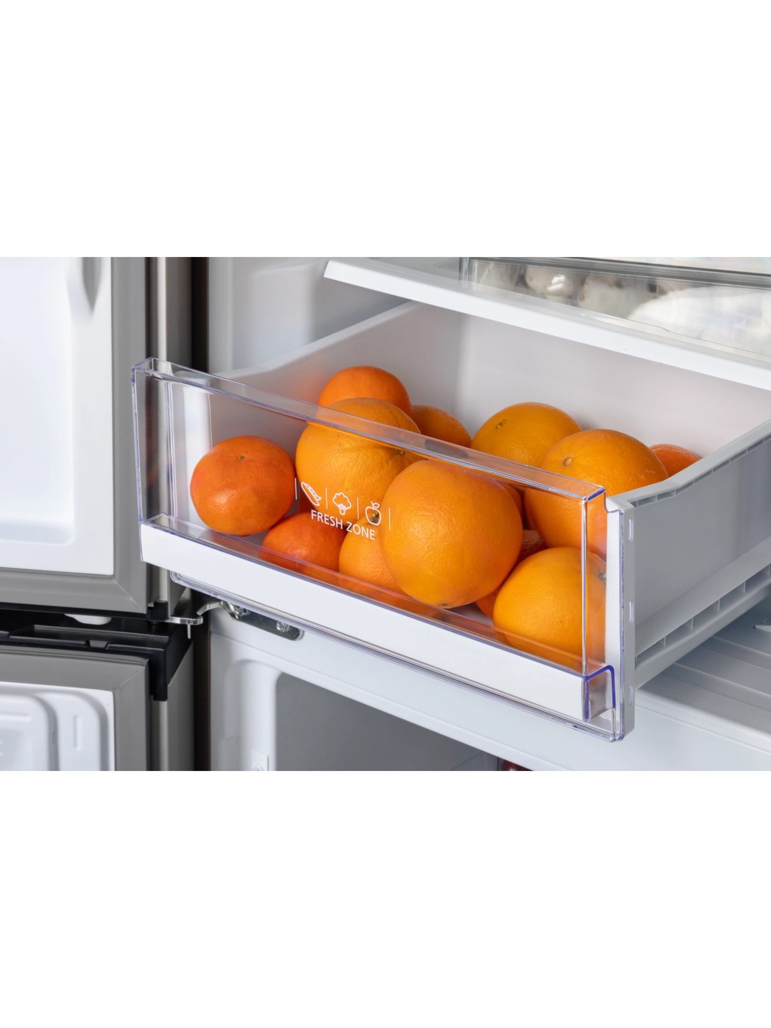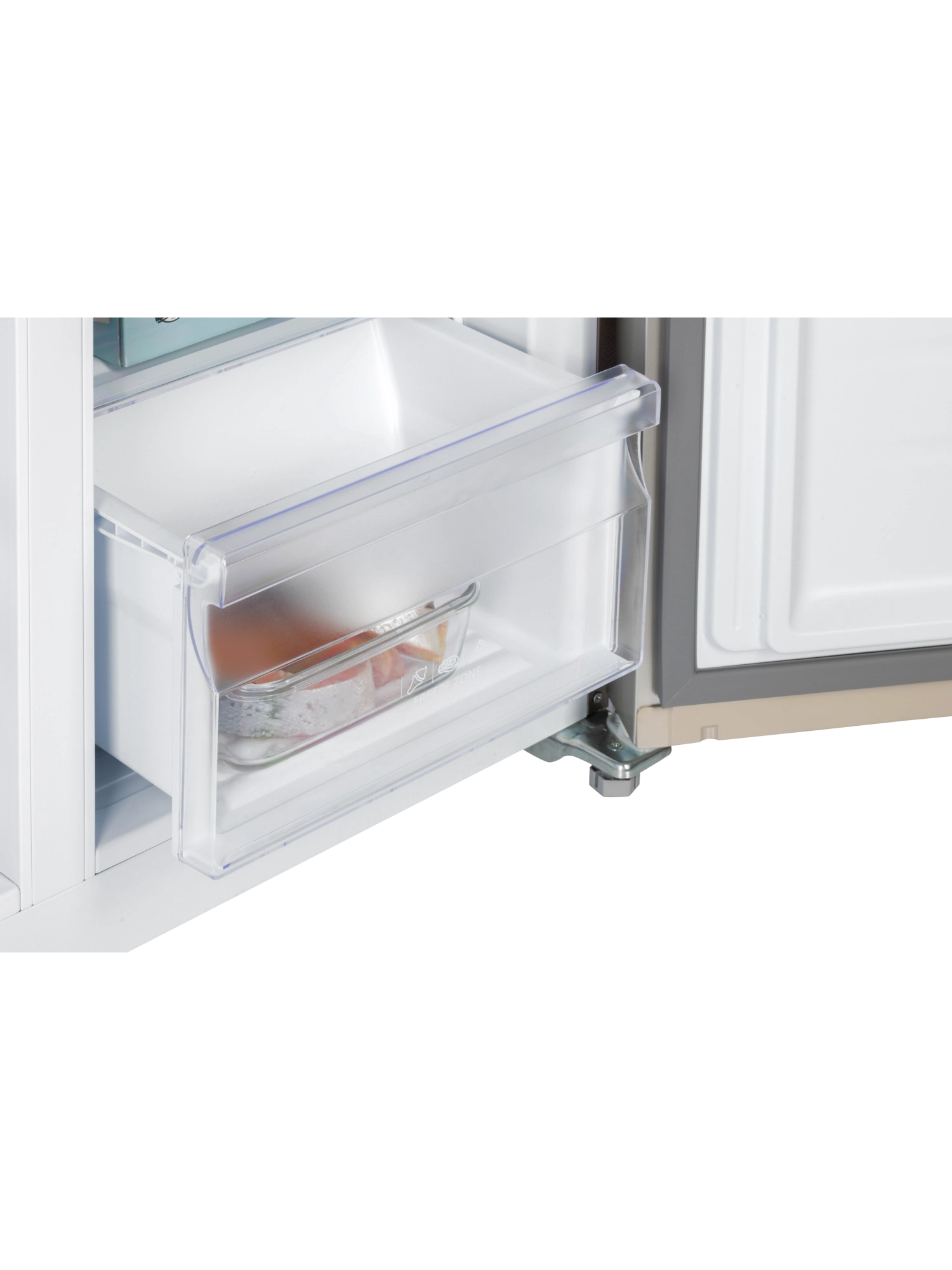 - Холодильное отделение с единым пространством удобно для хранения продуктов в габаритной посуде. Расположение стеклянных полок можно отрегулировать под высоту кастрюль и контейнеров. Нижние ящики для овощей и фруктов сохранят их свежесть и привлекательный вид, не утратив полезных свойств. Левый ящик с внутренней мембраной отлично справится с длительным хранением зелени благодаря повышенному уровню влажности.