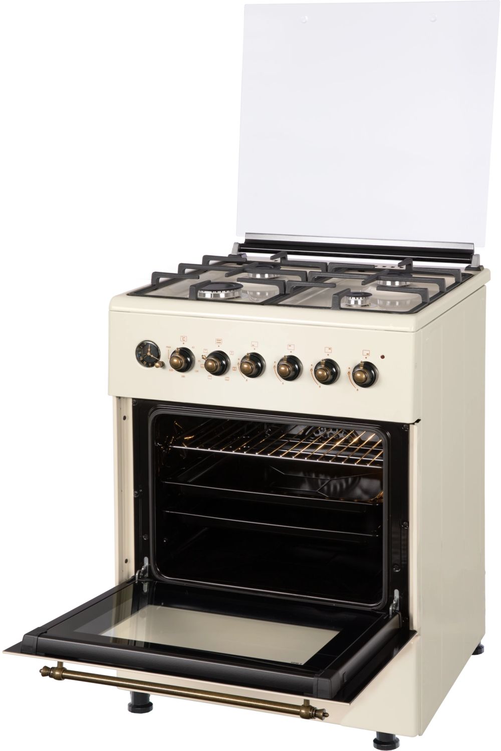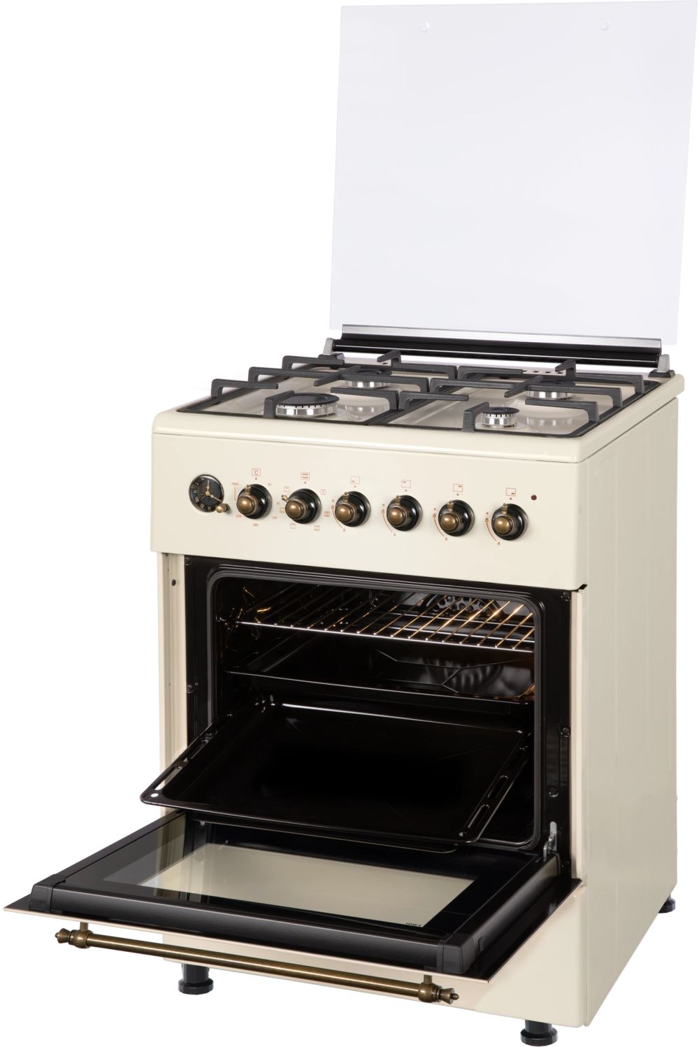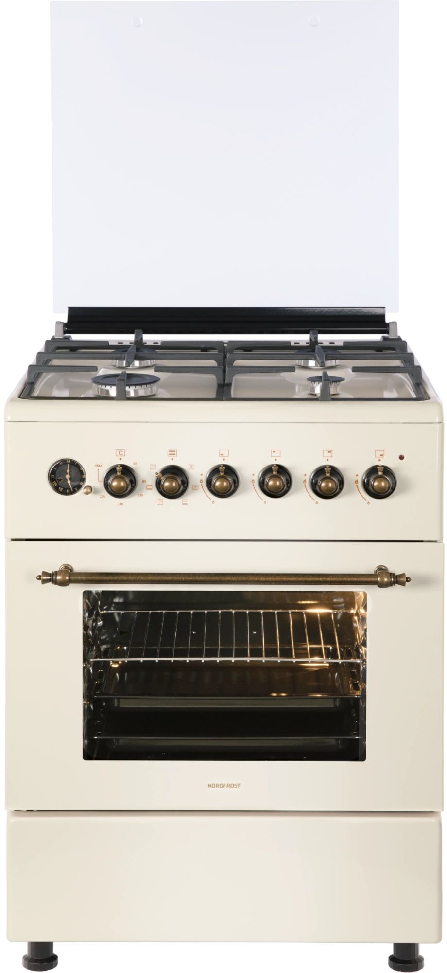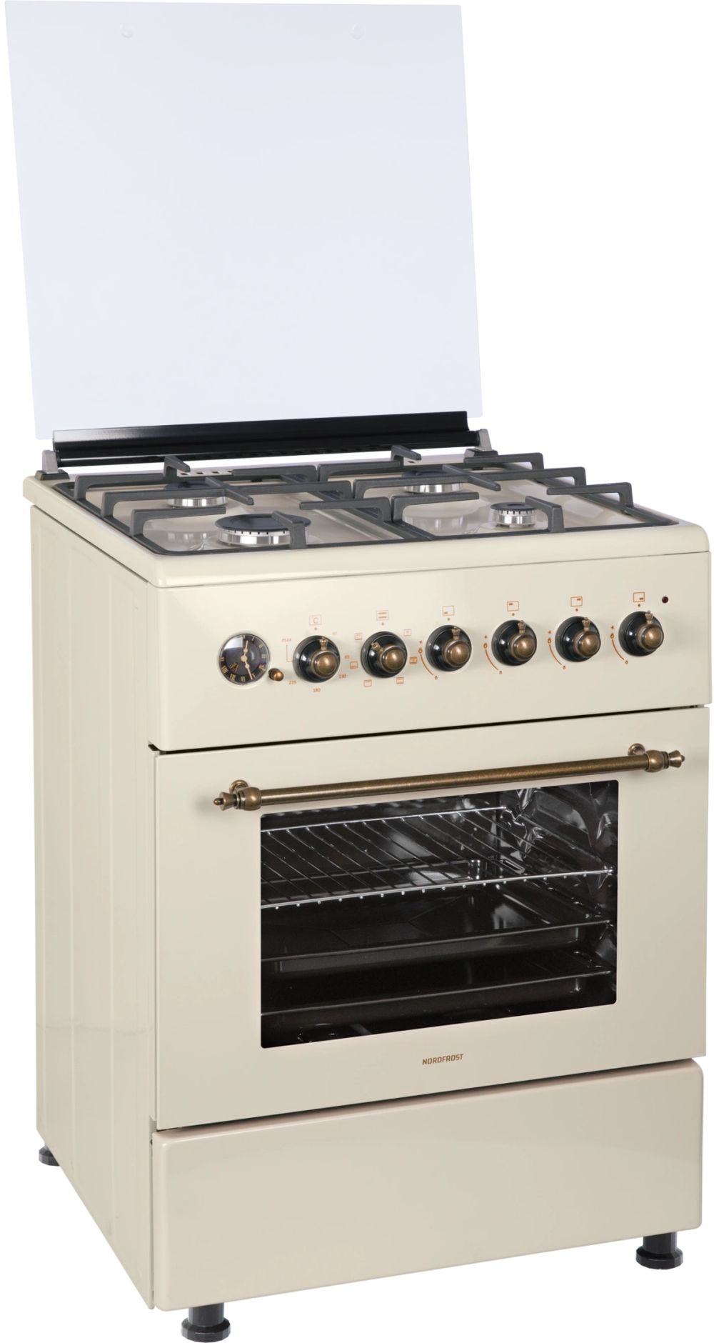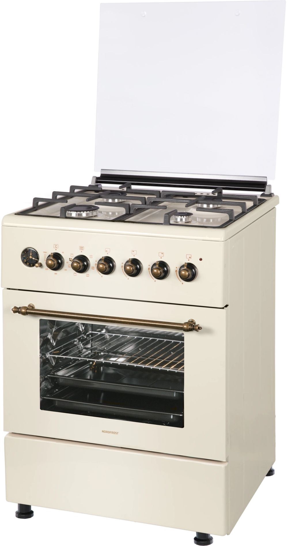 Выполненная в ретро стиле газоэлектрическая плита NORDFROST GE 6064 YR с объемом духовки 63 литра имеет функцию авторозжига и газ-контроль конфорок.