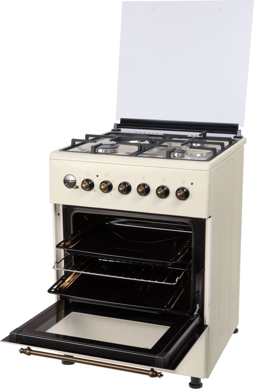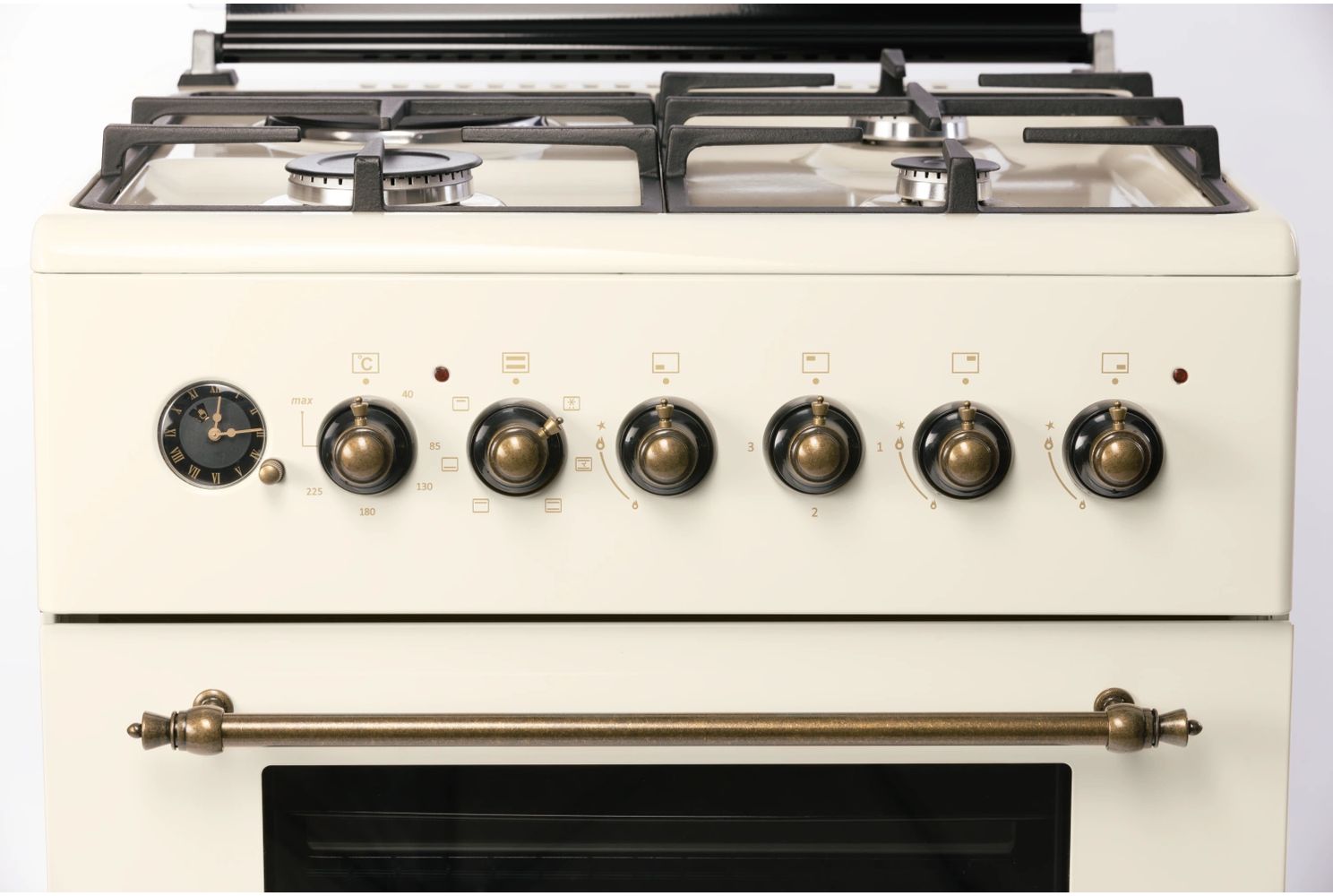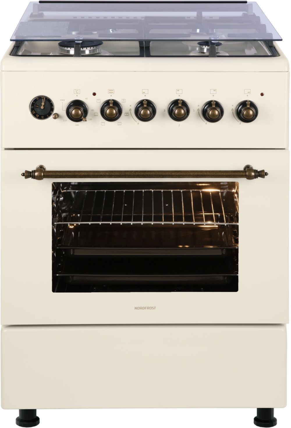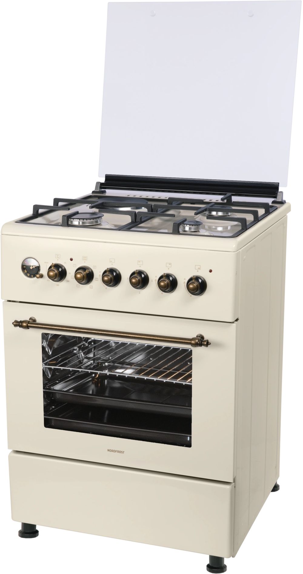 Выполненная в ретро стиле газоэлектрическая плита NORDFROST GE 6162 YR имеет объем духовки 63 литра, оснащена одной электрической экспресс-конфоркой и тремя газовыми конфорками с функцией авторозжига.