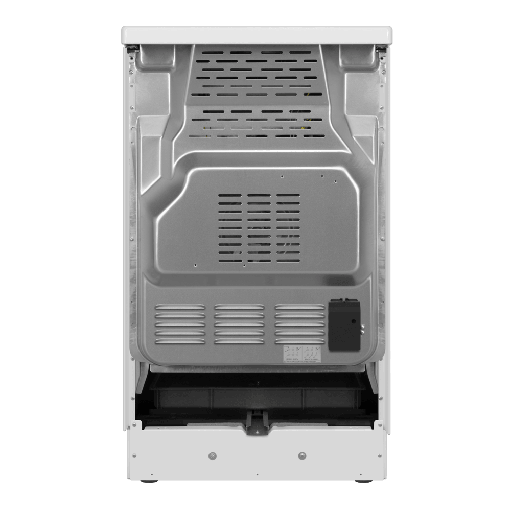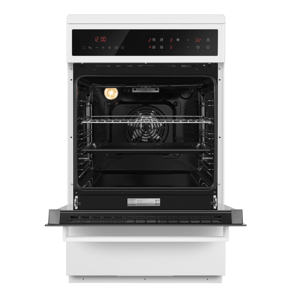 Полноразмерная электрическая плита с сенсорным управлением, варочная поверхность - стеклокерамическая. Техническое оснащение также на уровне - конфорки рабочего стола и духовой шкаф управляются сенсорами, в комплектацию входит многофункциональный таймер. Духовой шкаф оснащен конвекцией и грилем. Благодаря яркому внутреннему освещению виден весь объем духовки, нет необходимости открывать дверцу для контроля готовности блюда. Комфортная в эксплуатации, для удобства ухода за плитой, направляющие для противней - съемные и легко чистятся. Предусмотрен и ящик для хранения кухонной посуды. Модель по праву заслуживает место на Вашей кухне.